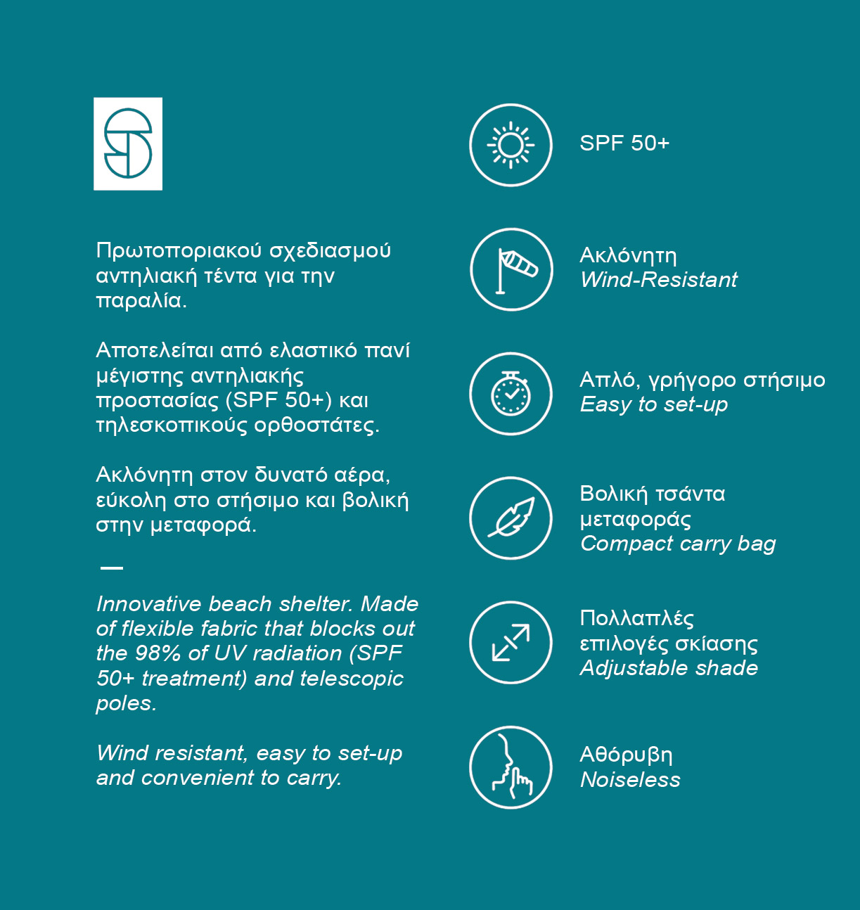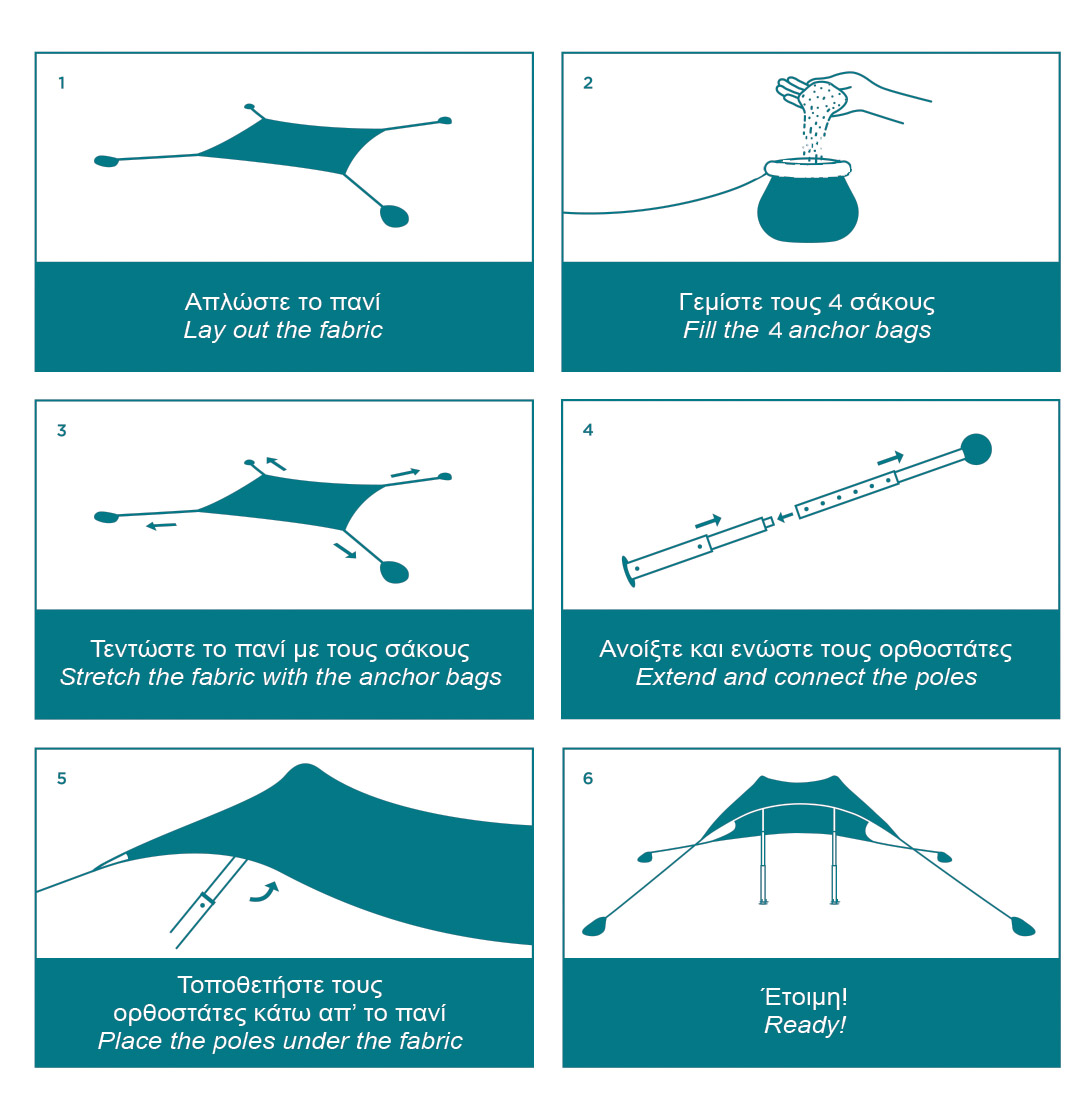 Αποτελείται από ελαστικό πανί μέγιστης αντηλιακής προστασίας SPF50+ , τηλεσκοπικούς ορθοστάτες αλουμινίου και σάκους αγκύρωσης.