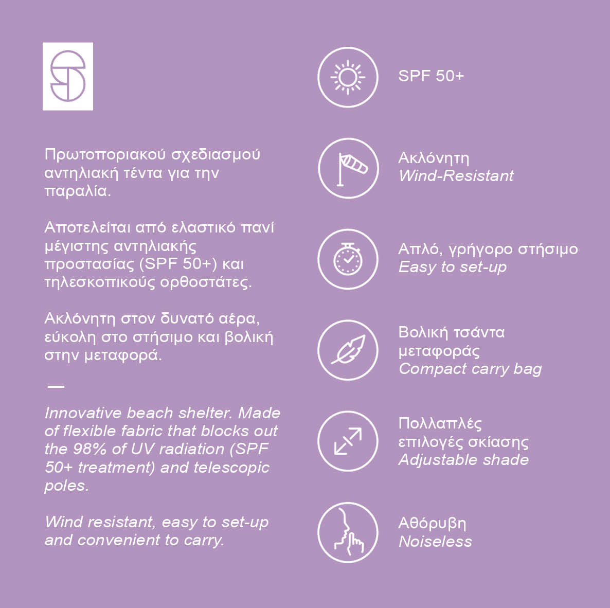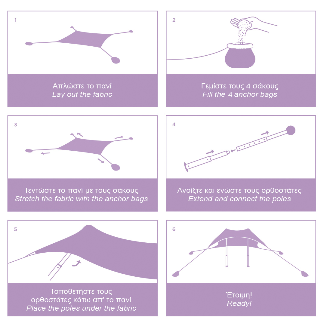 Αποτελείται από ελαστικό πανί μέγιστης αντηλιακής προστασίας SPF50+ , τηλεσκοπικούς ορθοστάτες αλουμινίου και σάκους αγκύρωσης.