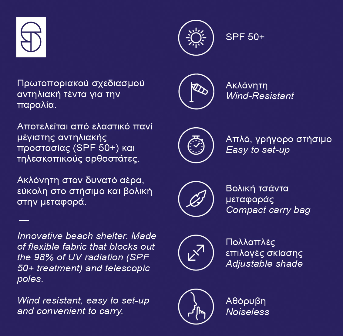 • Περιλαμβάνονται 4 σάκοι που γεμίζουν με άμμο ή βότσαλα για την σταθεροποίηση της τέντας