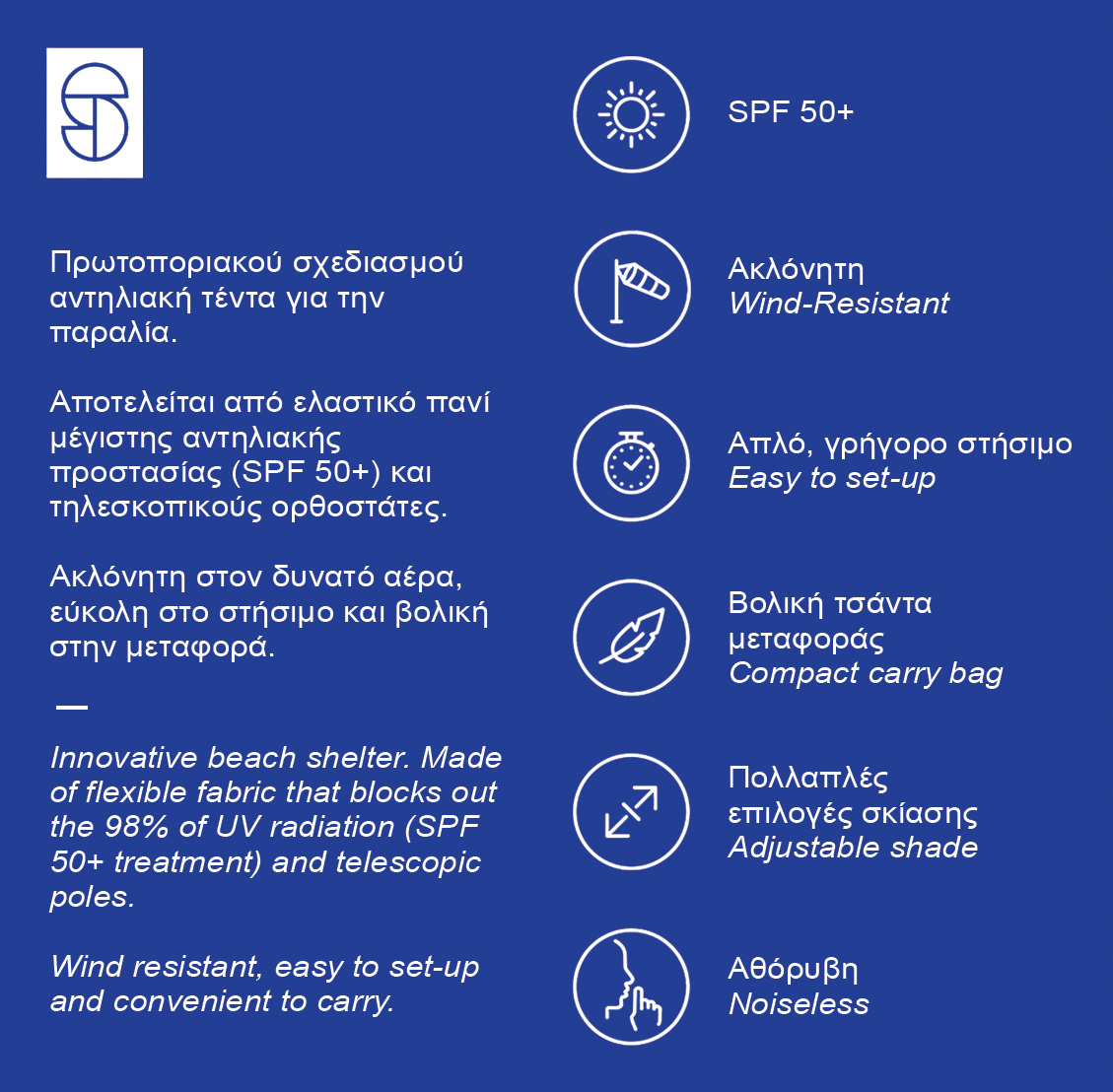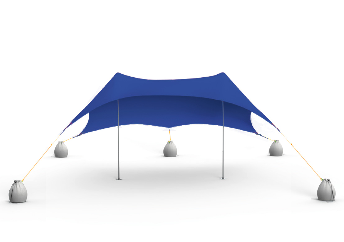 Ελαστική τέντα παραλίας με SPF 50+, εύκολη τοποθέτηση και αντοχή στους ανέμους.