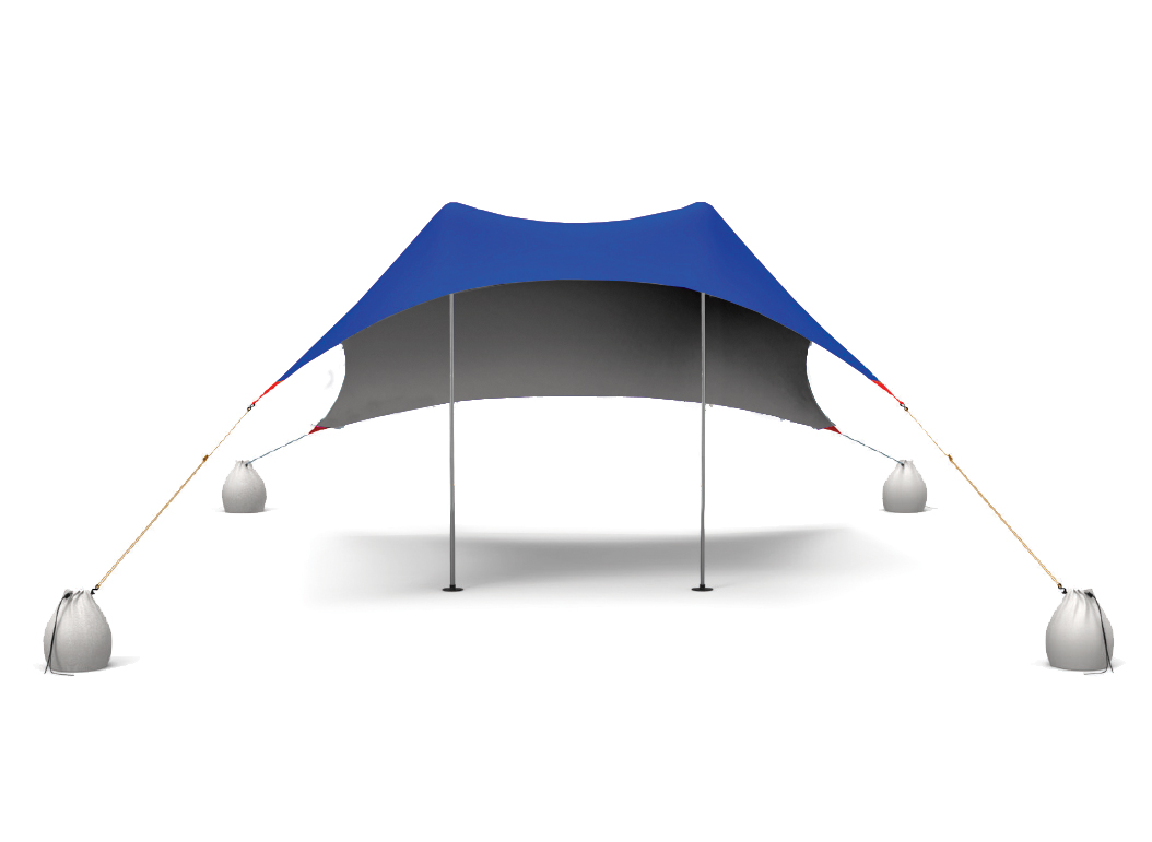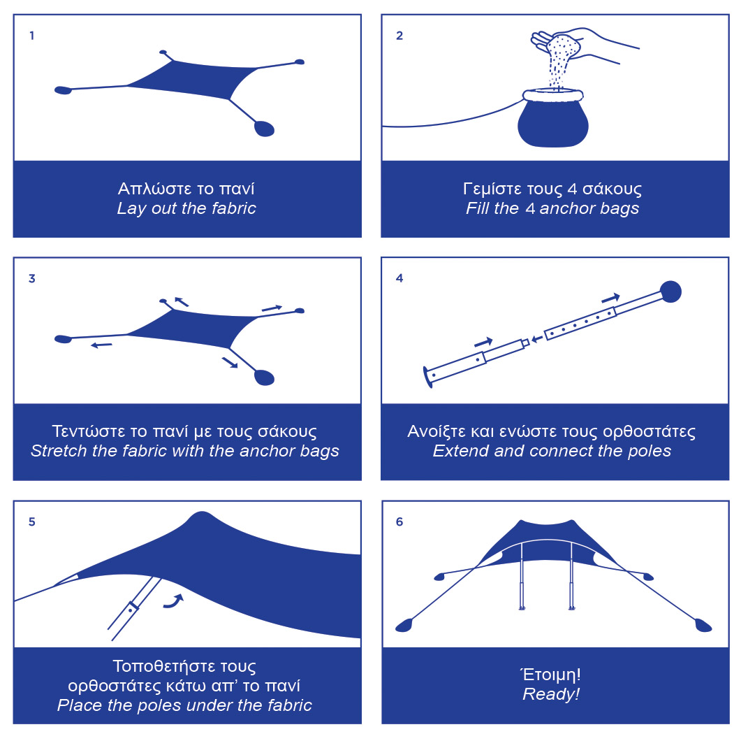 Αποτελείται από ελαστικό πανί μέγιστης αντηλιακής προστασίας SPF50+, τηλεσκοπικούς ορθοστάτες αλουμινίου και σάκους αγκύρωσης.