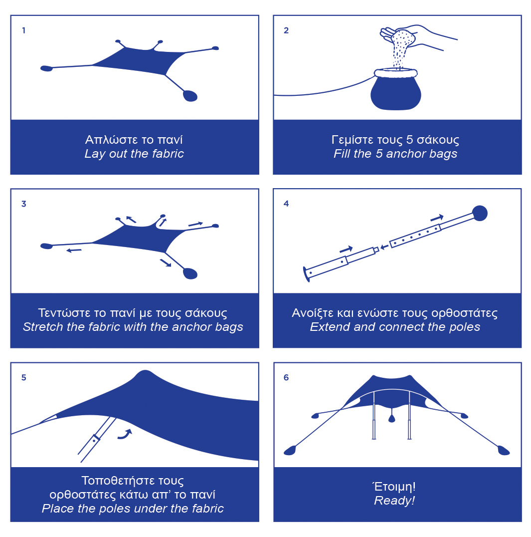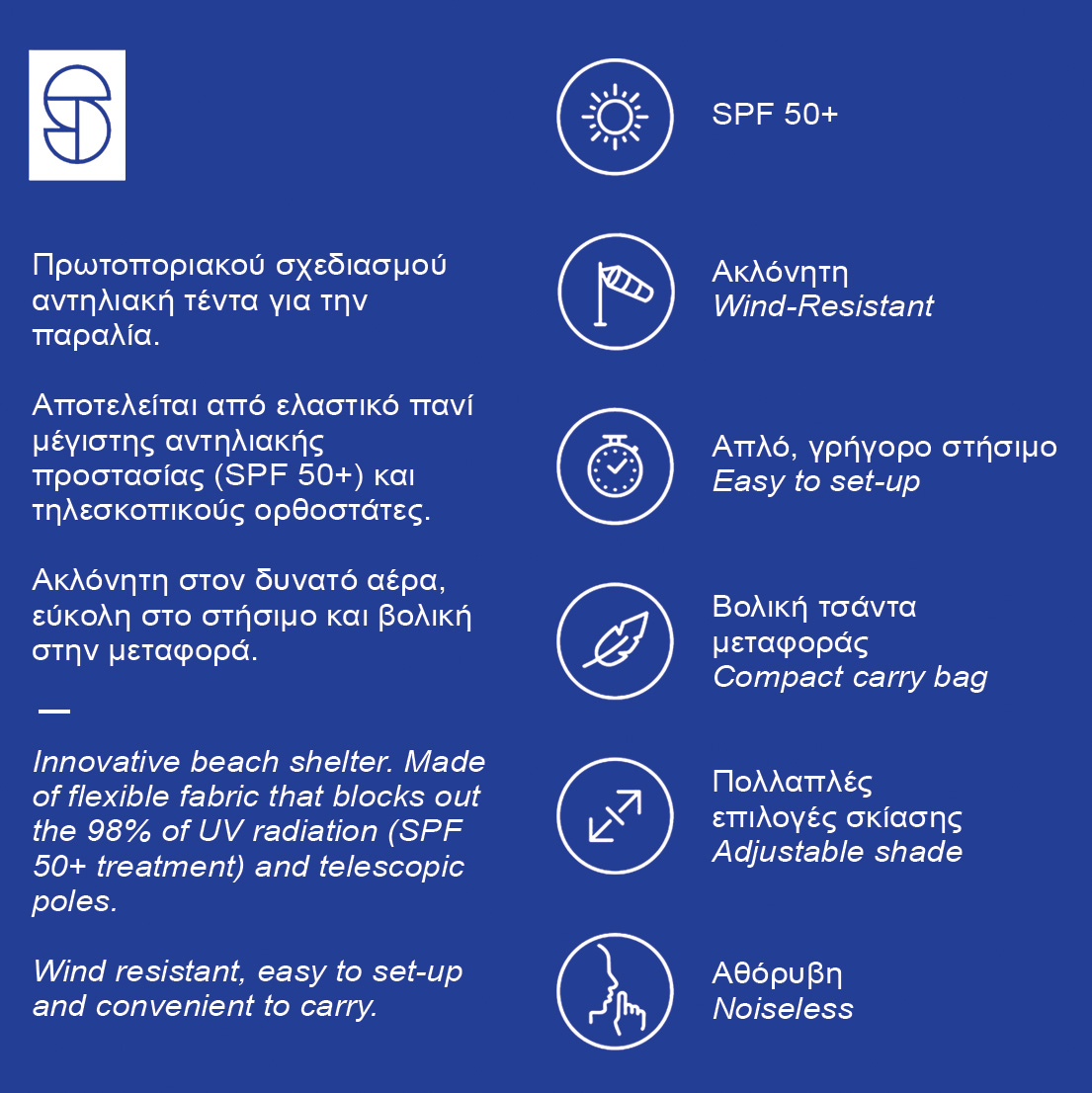 Αποτελείται από ελαστικό πανί μέγιστης αντηλιακής προστασίας SPF50+, τηλεσκοπικούς ορθοστάτες αλουμινίου και σάκους αγκύρωσης.