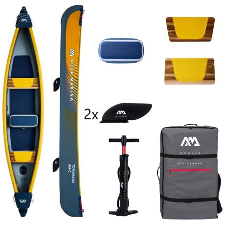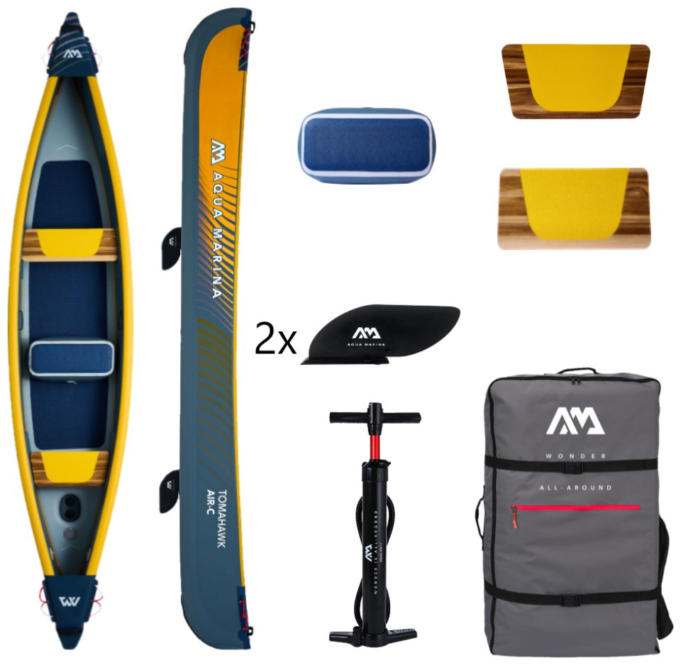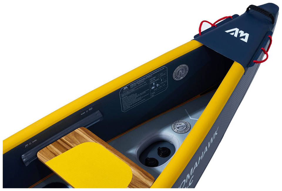 Το νέο και ανανεωμένο φουσκωτό καγιάκ Tomahawk III Air-C της Aqua Marina θα σας συναρπάσει! Σε νέο χρωματισμό με ναυτικό στυλ αλλά την ίδια εξαιρετική απόδοση στο νερό, προσεκτικά σχεδιασμένο για βελτιστοποίηση της ταχύτητας και της απόδοσης, διατηρώντας παράλληλα την άνεση και τη σταθερότητα, παρέχει απόλυτο έλεγχο και καταφέρνει εύκολο χειρισμό στις στροφές. Οι καρίνες διαθέτουν σχεδιασμό V κάτω από την πλώρη ώστε να σας παρέχουν σταθερή πορεία. Κατασκευασμένο για ταχύτητα και περιπέτεια, εξ ολοκλήρου με τεχνολογία Drop-stitch Light. Διασχίστε τα κύματα και απολαύστε τα δύσκολα νερά με ευκολία, καθώς αυτά τα κανό διαθέτουν όλα όσα χρειάζεστε γι'αυτό!