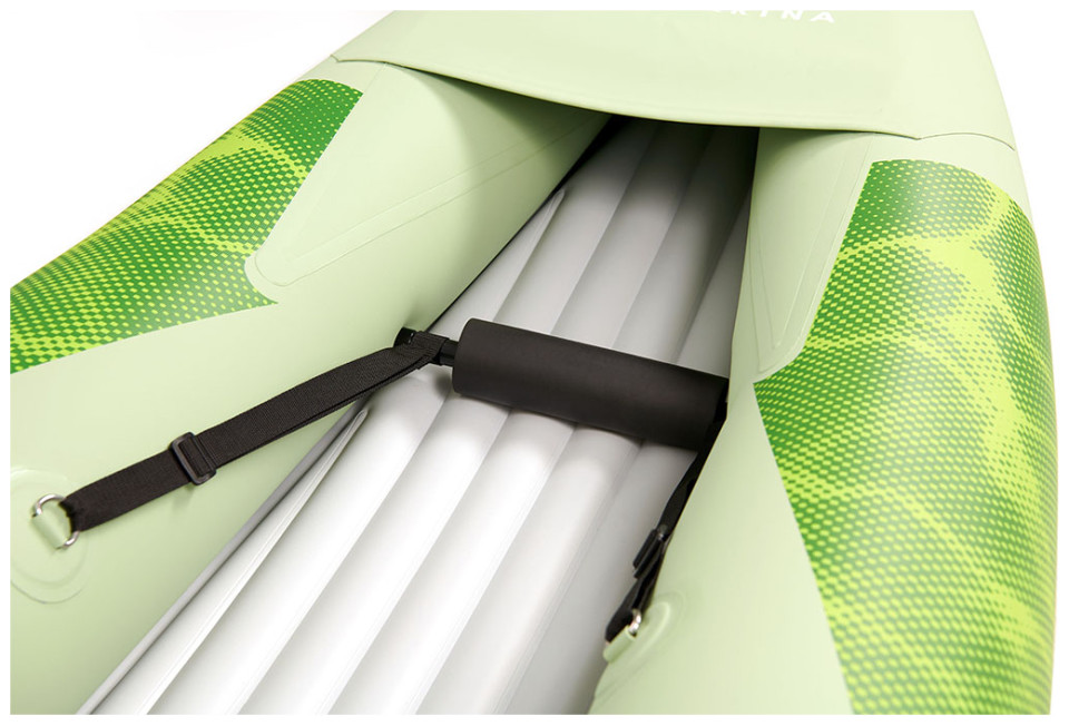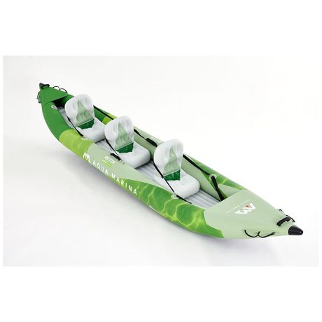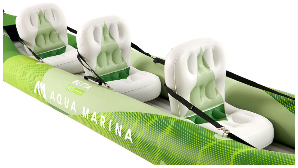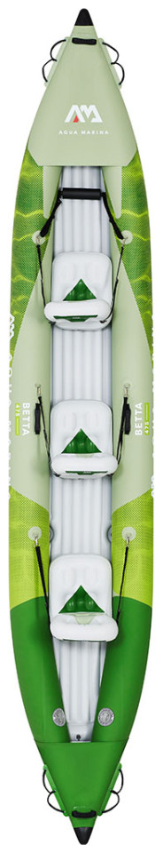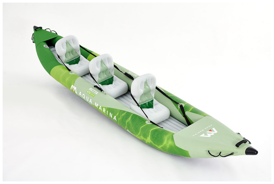 Φουσκωτό Καγιάκ 3 Ατόμων Betta της Aqua Marina σχεδιασμένo για ασφάλεια, σταθερότητα και απόδοση, εύκολα στον χειρισμό για ψυχαγωγική χρήση. Κατασκευασμένο από υψηλής αντοχής PVC στους πλαϊνούς θαλάμους αλλά και στο i-beam πάτωμα για μέγιστη αντοχή στον χρόνο και στην χρήση. Με σύστημα υψηλής απόδοσης 2 κεντρικών πτερυγίων για εξαιρετική διατήρηση ευθείας γραμμής. Διαθέτει 3 φουσκωτά καθίσματα με ψηλή πλάτη για άνεση και στήριξη καθόλη την διάρκεια χρήσης. Πλώρη σχεδιασμένη για να απομακρύνει τα νερά κατά την πλεύση, με χειρολαβή μεταφοράς από καουτσούκ. Εφοδιασμένο με πολλαπλές βαλβίδες ταχείας αποστράγγισης. Στην Συσκευασία περιλαμβάνεται 3 φουσκωτά καθίσματα υψηλής πλάτης, κουπί, 11'' αντλία ποδιού, τσάντα μεταφοράς, 2 κεντρικά πτερύγια Slide-In. Ιδανική επιλογή για τους λάτρεις της θάλασσας για να απολαμβάνουν το αγαπημένο τους χόμπι με ασφάλεια και άνεση.