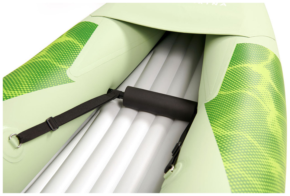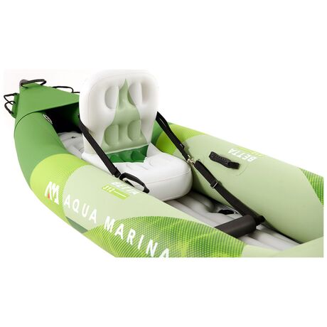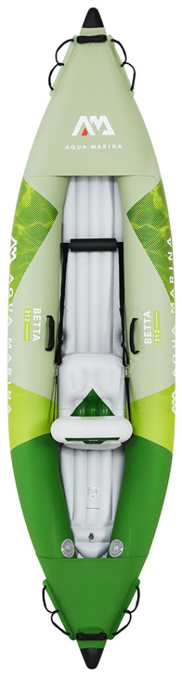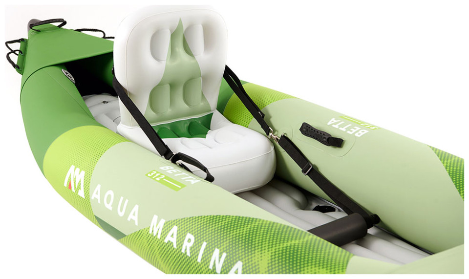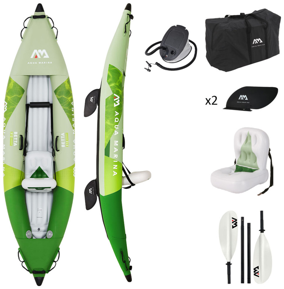 Φουσκωτό Καγιάκ Betta της Aqua Marina σχεδιασμένo για ασφάλεια, σταθερότητα και απόδοση, εύκολα στον χειρισμό για ψυχαγωγική χρήση. Κατασκευασμένο από υψηλής αντοχής PVC στους πλαϊνούς θαλάμους αλλά και στο i-beam πάτωμα για μέγιστη αντοχή στον χρόνο και στην χρήση. Με σύστημα υψηλής απόδοσης 2 κεντρικών πτερυγίων για εξαιρετική διατήρηση ευθείας γραμμής. Διαθέτει φουσκωτό κάθισμα με ψηλή πλάτη για άνεση και στήριξη καθόλη την διάρκεια χρήσης. Πλώρη σχεδιασμένη για να απομακρύνει τα νερά κατά την πλεύση, με χειρολαβή μεταφοράς από καουτσούκ. Εφοδιασμένο με πολλαπλές βαλβίδες ταχείας αποστράγγισης. Στην Συσκευασία περιλαμβάνεται 1 φουσκωτό κάθισμα υψηλής πλάτης, κουπί, 11'' αντλία ποδιού, τσάντα μεταφοράς, 2 κεντρικά πτερύγια Slide-In. Ιδανική επιλογή για τους λάτρεις της θάλασσας για να απολαμβάνουν το αγαπημένο τους χόμπι με ασφάλεια και άνεση.