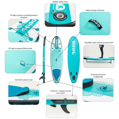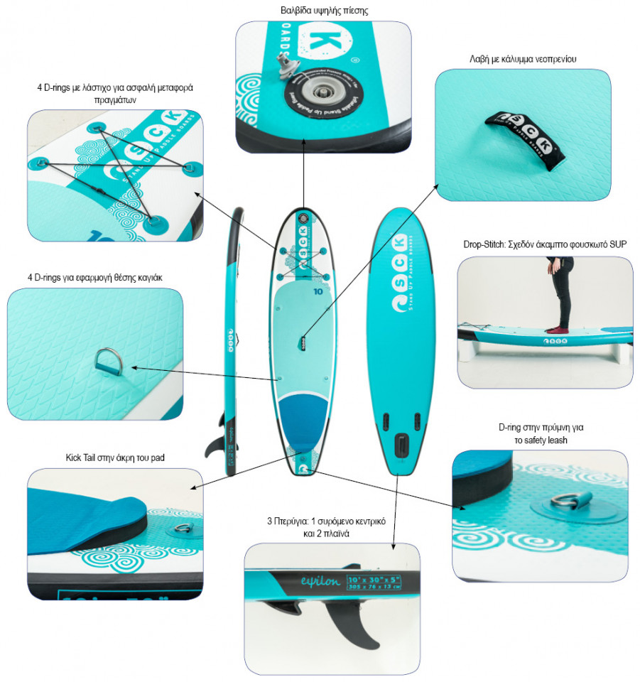 Φουσκωτή Σανίδα Sup 9' eψilon της SCK ιδανική επιλογή για τους λάτρεις των Watersports. Με διαστάσεις 275x76x13cm αποτελεί ιδανική επιλογή για αρχάριους χρήστες μέτριου αναστήματος και βάρους, γυναίκες και παιδιά με μέγιστο βάρος 98 κιλά. Ιδανική επιλογή και για αυτούς που θέλουν ένα γρήγορο φουσκωτό SUP που να είναι εύκολο στους ελιγμούς. Η κατασκευή από single layer drop stitch με πάχος σανίδας 5’ δίνει τέλεια σκληρότητα προσφέροντας πολύ καλή σταθερότητα. Με 5′ είστε πιο κοντά στην επιφάνεια του νερού, αποκτώντας έτσι καλύτερο έλεγχο στην ισορροπία σας. Το μεγάλο αντιολισθητικό pad δίνει χώρο, είναι άνετο για κάθε στάση και προσφέρεται ακόμα και για SUP yoga! Ιδιαίτερα ανθεκτικό, ακόμα και στα νυχάκια του αγαπημένου σας κατοικίδιου όταν σας συντροφεύει στις θαλάσσιες βόλτες. Τα D-rings για την εφαρμογή καθίσματος προεξέχουν από το pad χωρίς να ενοχλούν. Το κάθισμα του καγιάκ τοποθετείται έτσι ώστε το βάρος να κεντράρεται στην μέση της σανίδας. Έτσι θα έχετε μεγαλύτερη άνεση και καλύτερο χειρισμό της σανίδας ως καγιάκ. Το Kick tail στην πρύμνη και τα τρία πτερύγια εξυπηρετούν στο surf και βοηθάνε στις επιτόπιες στροφές. Στην Συσκευασία Περιλαμβάνεται: Κουπί αλουμινίου ρυθμιζόμενο από 165cm έως 220cm στο ύψος με σφικτήρα, όπου αν χρειαστεί να αυξήσετε την πίεση του κλείστρου μπορείτε να το κάνετε επιτόπου χωρίς εργαλεία. Το τύπωμα είναι στην πίσω πλευρά του πτερυγίου. Την πλευρά που κοιτάζει προς τα εσάς όταν κάνετε κουπί. Η διπλής ενεργείας τρόμπα μειώνει τον χρόνο που χρειάζεται η σανίδα για να φουσκώσει. Μπορεί όμως να γίνει μονής ώστε να είναι πιο εύκολο το φούσκωμα όταν κατά την αύξηση της πίεσης του αέρα υπάρχει αντίσταση στην τρόμπα. Τσάντα Μεταφοράς, Ένας ενιαίος μεγάλος χώρος, που μπορείτε να χωρέσετε το SUP και τον εξοπλισμό του, εύκολα και χωρίς στρίμωγμα. Leash ασφαλείας, σε γαλάζιο χρώμα και τέλος ένα κιτ επισκευής για την επιδιόρθωση πιθανόν μελλοντικών φθορών. Απολαύστε ξέγνοιαστες στιγμές διασκέδασης με την σανίδα Sup eψilon, χάρη στην ποιότητα και αξιοπιστία της εταιρείας SCK.