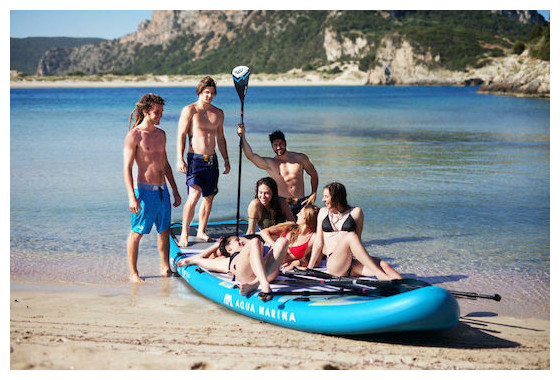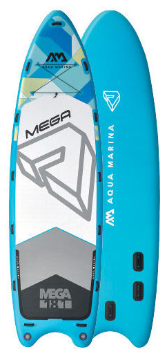 Ένα γιγάντιο Sup από την Aqua Marina κατάλληλο για καθέλκυση στη θάλασσα και στο ποτάμι, που έχει δοκιμαστεί από έμπειρους αναβάτες και έχει επιβεβαιωθεί ότι αντέχει ακόμη και στις πιο σκληρές συνθήκες! Η φουσκωτή σανίδα όρθιας κωπηλασίας Mega Group 18’1’’ αποτελεί εξαιρετική επιλογή, εάν θέλετε να περάσετε ανεπανάληπτες στιγμές διασκέδασης στο νερό μαζί με τους φίλους ή την οικογένειά σας! Χάρη στις μεγάλες διαστάσεις της 550 x 152 x 20 cm, αλλά και στο ωφέλιμο βάρος έως 650 κιλά, σας παρέχει τη δυνατότητα να κωπηλατείτε μαζί με μεγάλη παρέα έως έξι ατόμων. Για να καθίσταται εξαιρετικά ανθεκτική αλλά και σταθερή, διαθέτει άκαμπτη κατασκευή και σύστημα 5 πτερυγίων στο κεντρικό της τμήμα, ενώ για να σας προσφέρει εξαιρετική εργονομία μπορεί να ξεφουσκώνει και να τυλίγεται πολύ εύκολα και γρήγορα, ώστε να την αποθηκεύετε με μεγάλη άνεση! Παράλληλα χάρη στις πολλαπλές της χειρολαβές, σας διευκολύνει στη μεταφορά της, ώστε να την κουβαλάτε με άνεση και ευκολία κατά τις εξορμήσεις σας. Το προϊόν συνοδεύεται, εκτός από τα 5 κεντρικά πτερύγια και τις χειρολαβές, από αντάπτορα βαλβίδας, αντλία αέρος χειρός και βάση για την προσάρτηση action κάμερας σε περίπτωση που θέλετε να καταγράφετε τις περιπέτειές σας στο υγρό στοιχείο. Επιπλέον, μαζί με τη σανίδα διατίθεται και πρακτικό σακίδιο πλάτης για να μπορείτε να μεταφέρετε με ευκολία και άνεση όλο τον απαραίτητο εξοπλισμό της αγαπημένης σας δραστηριότητας! Πρόκειται για μια ανθεκτική επιλογή, ειδικά σχεδιασμένη για να σας παρέχει μοναδικές στιγμές περιπέτειας και διασκέδασης με τους φίλους σας στο νερό!