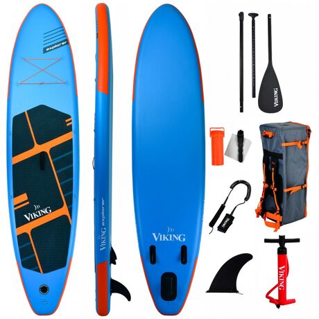 Φουσκωτή Σανίδα Sup All Around Explorer 11' της Viking με εξαιρετικά υδροδυναμικό σχήμα και μία τονισμένη μύτη που ισορροπεί ανάμεσα στα All Round και Touring Sup. To Explorer είναι μία πολύ αξιόλογη λύση για αυτόν που ξεκινά την όρθια κωπηλασία καθώς είναι σταθερό και άνετο με φαρδύ κατάστρωμα. Το καλύτερο είναι ότι δεν θα χρειαστεί να αλλάξει σανίδα αργότερα και όσο βελτιώνει την τεχνική του αφού το Explorer έχει τα δυναμικά χαρακτηριστικά που ικανοποιούν και τον πιο έμπειρο χρήστη. Τα Viking Sup κατασκευάζονται με βάση την τεχνολογία Welding Rail που αυξάνει την αντοχή στην εσωτερική πίεση στο μέγιστο των 25 psi. Αυτή η τεχνολογία επιτρέπει τη μηχανική συγκόλληση στρωμάτων PVC (Welding Rail Tech) χωρίς τη χρήση κόλλας και επιτυγχάνει την ένωση δύο επιφανειών σε μία ενιαία και ατόφια δομή, βελτιώνοντας κατακόρυφα την αντοχή του Sup ειδικά στο πλάι της σανίδας ( ρέλια ) όπου συγκλίνουν οι δύο επιφάνειες και όπου εκδηλώνονται οι μεγαλύτερες πιέσεις. Όλα τα Viking Sup κατασκευάζονται με πάχος 15 εκατοστών που προσδίδει αυξημένη πλευστότητα και σταθερότητα σε συνθήκες ήπιου κυματισμού. Επιπλέον ο πυρήνας τους κατασκευάζεται με υπέρ – ενισχυμένο και πυκνό Drop Stich υλικό που τους δίνει την πολυπόθητη ακαμψία. Ο συνδυασμός των παραπάνω δημιουργεί ένα Sup που προσαρμόζεται με επιτυχία στις ανήσυχες Ελληνικές θάλασσες. Εξελιγμένο υδροδυναμικό σχήμα που τα κάνει γρήγορα και υπάκουα στις εντολές του αναβάτη. Η σχεδίαση της μύτης, τους επιτρέπει να γλιστρούν άνετα και ευθύβολα στο νερό ακόμα και σε ελαφρό κυματισμό. Εφοδιάζονται με 3 πτερύγια για αυξημένη κατευθυντικότητα. Ταυτόχρονα οι γενναιόδωρες διαστάσεις τους συνδυάζονται ισορροπημένα με ένα προοδευτικό Rocker profile, εμπνέοντας ασφάλεια και σταθερότητα. Ασφαλής αποθήκευση αντικειμένων στην πλώρη με Bungee Cords που αγκιστρώνουν σε 4 ανοξείδωτους κρίκους. Βαθιά αντιολισθητική επίστρωση καταστρώματος με υλικό EVA σε σχήμα διαμαντιού για αυξημένη πρόσφυση των πελμάτων και ισορροπία. Βαλβίδα ασφαλείας για την σωστή πλήρωση με αέρα και την απόλυτη στεγανοποίηση του Sup. Ανοξείδωτος κρίκος για την αγκίστρωση του safety leash. Επιπλέον κρίκοι υπάρχουν στο μέσο του καταστρώματος για την πρόσδεση καθίσματος Kayak. Η Συσκευασία περιλαμβάνει όλα τα απαραίτητα αξεσουάρ για να απολαμβάνεται με άνεση το αγαπημένο σας Χόμπι.