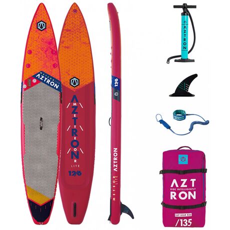 Φουσκωτή Σανίδα Sup Meteorlite Race 12'6'' της Aztron ιδανική επιλογή για αγωνιστική χρήση. Με μήκος 381, πλάτος 69 εκατοστά, ίσιο περίγραμμα, Kick Pad στην ουρά και στενή μύτη το Meteorlite διαθέτει τις ιδανικές αναλογίες για να πλεύσει με ταχύτητα και να αποκριθεί δυναμικά και άμεσα στις εντολές του αναβάτη του. Ο πυρήνας του κατασκευάζεται από πολύ υψηλής πυκνότητας drop stich υλικό ενώ τα ρέλια του είναι ενισχυμένα με πολλαπλές επιστρώσεις ώστε να αντέχουν στον πλάγιο κυματισμό, κάτι το σύνηθες στις Ελληνικές θάλασσες. Διαθέτει όπως όλα τα Sup της Aztron διπλό θάλαμο (Double Chamber) ώστε να είναι 30% πιο συμπαγές και άκαμπτο αλλά και να προσφέρει ασφάλεια πλεύσης υπό όλες τις συνθήκες. Ασφάλεια μεταφοράς αντικειμένων χάρις στο έξυπνο ρυθμιζόμενο σύστημα που διαθέτει, κουβαλήστε το σνακ σας το νερό σας και ότι άλλο χρειάζεστε κατά την διάρκεια τις πλεύσης σας. Η Συσκευασία περιλαμβάνει όλα τα απαραίτητα αξεσουάρ για να απολαμβάνεται με άνεση το αγαπημένο σας χόμπι. Αναλυτικότερα η συσκευασία περιλαμβάνει 1 τρόμπα χειρός διπλής ενέργειας, δέστρα αστραγάλου, πτερύγιο, κιτ επισκευής για την επιδιόρθωση πιθανόν μελλοντικών φθορών, και τσάντα μεταφοράς για να μεταφέρετε και να αποθηκεύετε με ασφάλεια και άνεση όλο τον απαραίτητο εξοπλισμό σας.