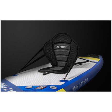 Φουσκωτή Σανίδα Sup Neptune 12'6'' Aztron είναι ιδανικό για χρήστες που θέλουν να καλύψουν με γρήγορο ρυθμό μεγάλες αποστάσεις. Εχει κορυφαίο υδροδυναμικό σχεδιασμό, ξεκινώντας από το κωνικού σχήματος εμπρόσθιο τμήμα, συνεχίζοντας με ένα κυρίως σώμα αρμονικών γραμμών που σχηματίζουν ένα προοδευτικό rocker profile και καταλήγοντας σε μία μελετημένη τραπεζοειδή ουρά με ανεβασμένο τελείωμα (kick Tail) που επιτρέπει σε αυτό το μεγάλο iSUP να στρέφει αποτελεσματικά, να αντιδρά γρήγορα και να συγχωρεί λάθη! Ο πυρήνας του κατασκευάζεται από πολύ υψηλής πυκνότητας drop stich υλικό ενώ τα ρέλια του είναι ενισχυμένα με πολλαπλές επιστρώσεις ώστε να αντέχουν στον πλάγιο κυματισμό, κάτι το σύνηθες στις Ελληνικές θάλασσες. Ασφαλή μεταφορά φορτίων χάρις στο είδικά τοποθετημένο σύστημα στο μπροστινό μέρος! Ενσωματωμένη χειρολαβή για εύκολη και άνετη μεταφορά. Όλες οι λαβές της Aztron φτιάχνονται από υψηλής ποιότητας νεοπρένιο και ενισχύονται με λαστιχένιο μαξιλαράκι ώστε να έχουν αντοχή και σίγουρο κράτημα. Αντιολισθητική επίστρωση EVA στο κατάστρωμα με 4mm αυλάκωση σε διαμαντένιο σχέδιο, προσφέρει την απόλυτη σταθερότητα στο πέλμα. Όπως όλα τα Touring iSUP της Aztron, το Neptune έχει προικιστεί με τις καινοτόμες τεχνολογίες Double Champer και Double Layer Fusion (διπλός θάλαμος – διπλή επίστρωση υλικού με Fusion) που αυξάνουν εκθετικά την ακαμψία και την ασφάλεια των iSUP, μειώνοντας ταυτόχρονα το βάρος τους. Το ψηλό Rocker της πλώρης συνδυάζεται με το Kick Pad της πρύμνης για να αυξήσει την σταθερότητα και την ικανότητα στην κυματώδη θάλασσα, ενώ βελτιώνει και την ικανότητα στροφής. Το αποτέλεσμα είναι ένα iSUP που προσεγγίζει την στιβαρότητα και την ασφάλεια μιας σταθερής σανίδας ενώ είναι ελαφρύτερο από τα υπόλοιπα iSUP κερδίζοντας σε ταχύτητα και ευχρηστία. Ταυτόχρονα είναι ένα από τα ελάχιστα Touring iSUP που διατηρεί την σταθερότητα και κατευθυντικότητα του ακόμα και σε άστατα νερά.