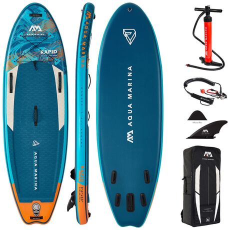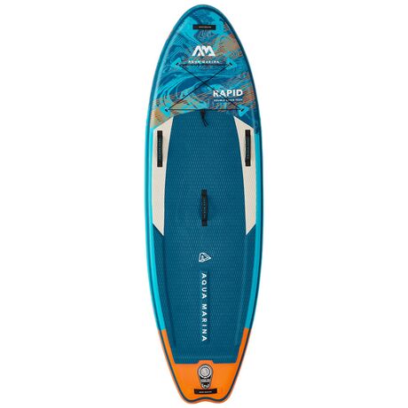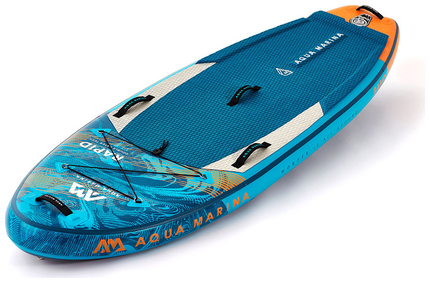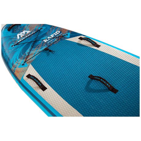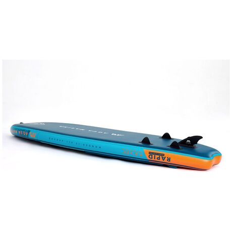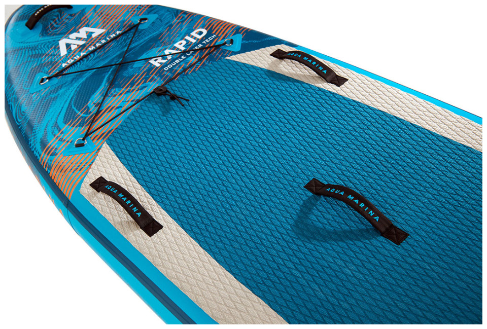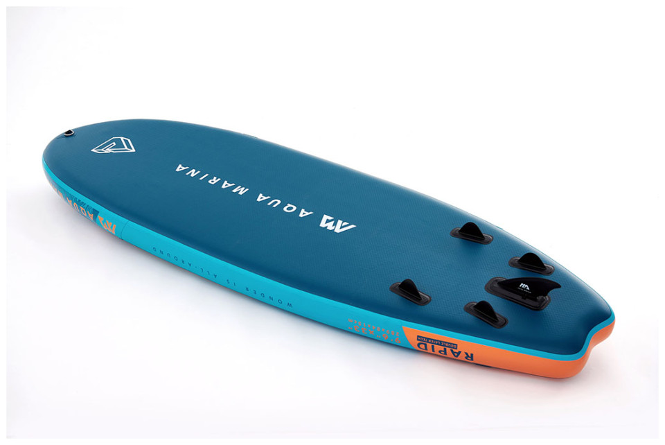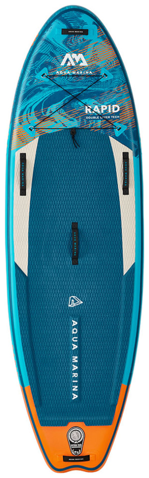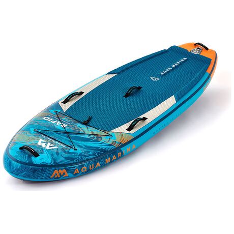 Η φουσκωτή σανίδα Sup Rapid της Aqua Marina είναι κατασκευασμένη με τεχνολογία διπλού τοιχώματος για 25-30% μεγαλύτερη ακαμψία . Η ανάγλυφη επένδυση «crocodile skin» και το αντιολισθητικό υλικό EVA προσφέρουν τη μέγιστη σταθερότητα και άνεση. Διαθέτει πλευρική ενίσχυση με ρέλι 1000 denier. Ακόμη ο νέος υδροδυναμικός σχεδιασμός επιτρέπει τη γρήγορη πορεία. Έχει σημείο συγκράτησης αντικειμένων με ελαστικό κορδόνι και μηχανισμό ρύθμισης, 5 συμπαγείςς χειρολαβές από νεοπρένιο με επένδυση ιμάντα για μεγαλύτερη αντοχή και άνεση, kick pad στην ουρά για επιτόπιες στροφές και ελιγμούς, αναβαθμισμένη βαλβίδα αέρος για μεγαλύτερη στεγανότητα και αποσπώμενο slide-in πτερύγιο racing. Το Sup της Aqua Marina περιέχει σάκο μεταφοράς με φερμουάρ,λουρί αστραγάλου σπιράλ και αντλία αέρος διπλής ενέργειας Liquid Air V1.
