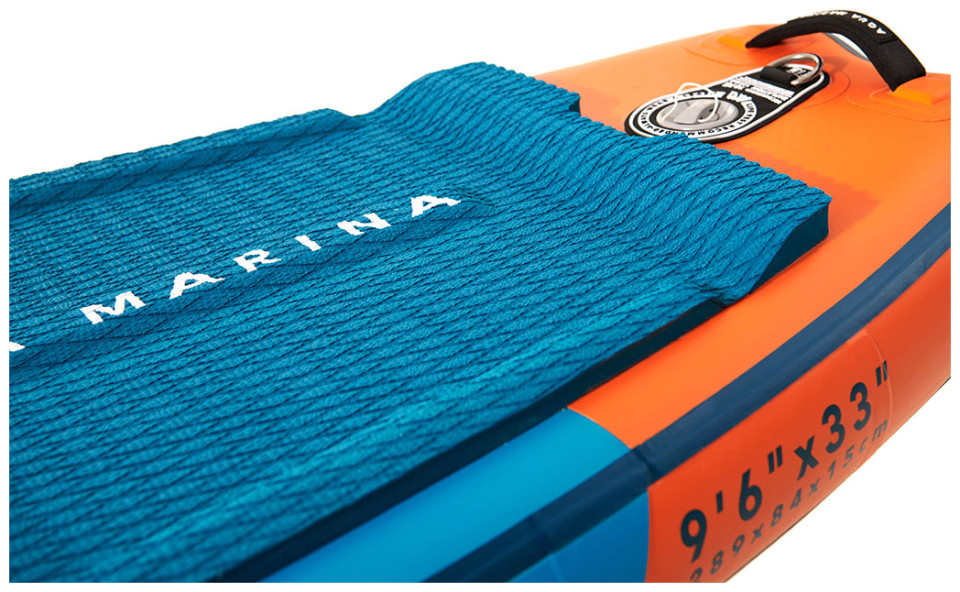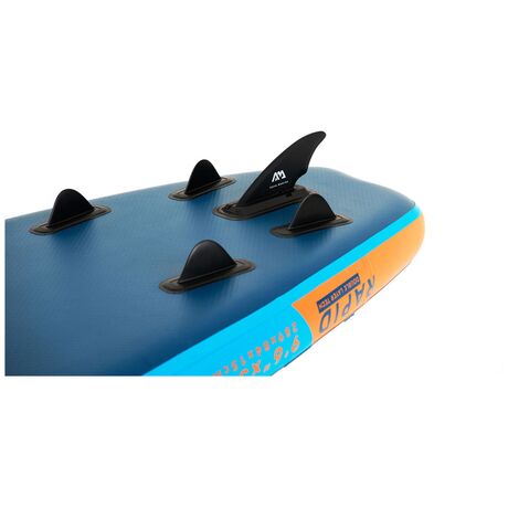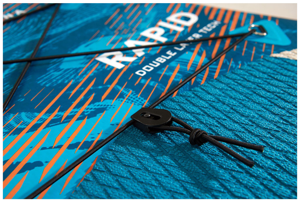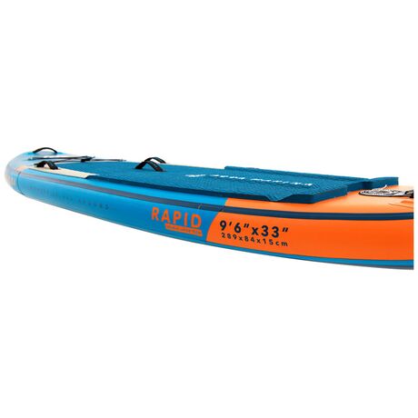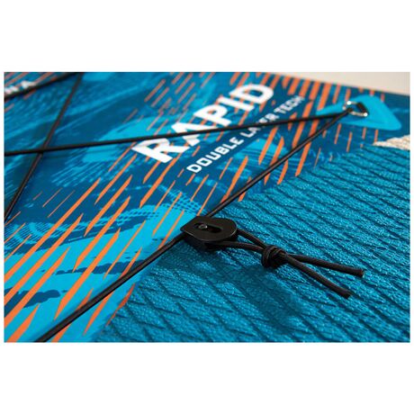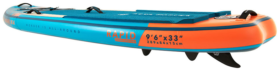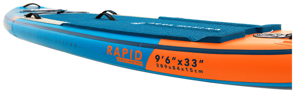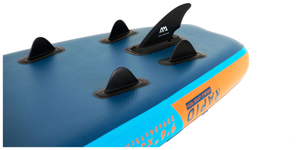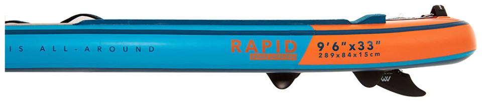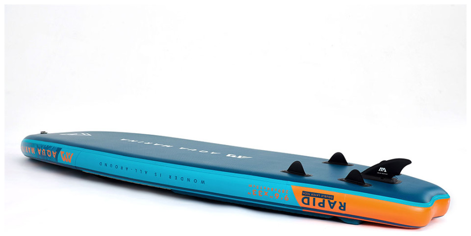 Η φουσκωτή σανίδα Sup Rapid της Aqua Marina είναι κατασκευασμένη με τεχνολογία διπλού τοιχώματος για 25-30% μεγαλύτερη ακαμψία . Η ανάγλυφη επένδυση «crocodile skin» και το αντιολισθητικό υλικό EVA προσφέρουν τη μέγιστη σταθερότητα και άνεση. Διαθέτει πλευρική ενίσχυση με ρέλι 1000 denier. Ακόμη ο νέος υδροδυναμικός σχεδιασμός επιτρέπει τη γρήγορη πορεία. Έχει σημείο συγκράτησης αντικειμένων με ελαστικό κορδόνι και μηχανισμό ρύθμισης, 5 συμπαγείςς χειρολαβές από νεοπρένιο με επένδυση ιμάντα για μεγαλύτερη αντοχή και άνεση, kick pad στην ουρά για επιτόπιες στροφές και ελιγμούς, αναβαθμισμένη βαλβίδα αέρος για μεγαλύτερη στεγανότητα και αποσπώμενο slide-in πτερύγιο racing. Το Sup της Aqua Marina περιέχει σάκο μεταφοράς με φερμουάρ,λουρί αστραγάλου σπιράλ και αντλία αέρος διπλής ενέργειας Liquid Air V1.