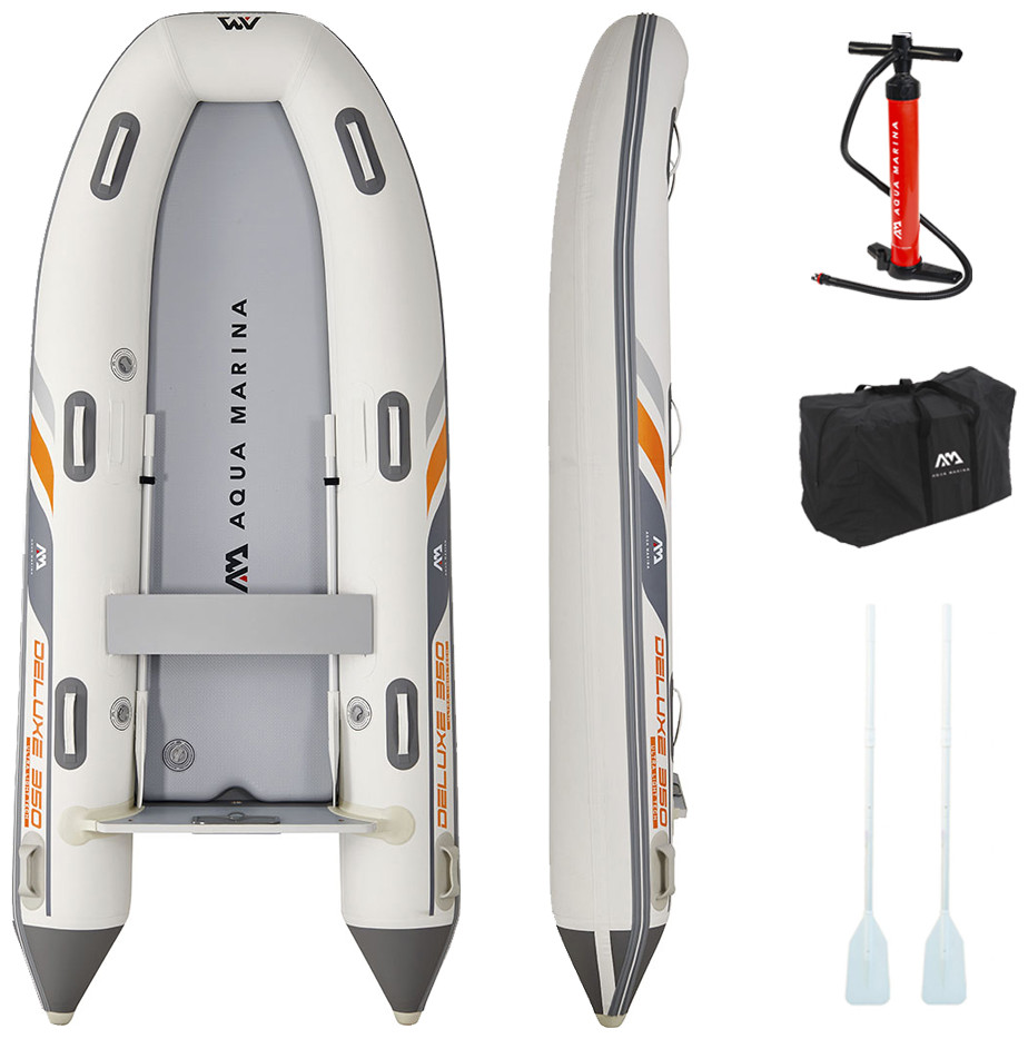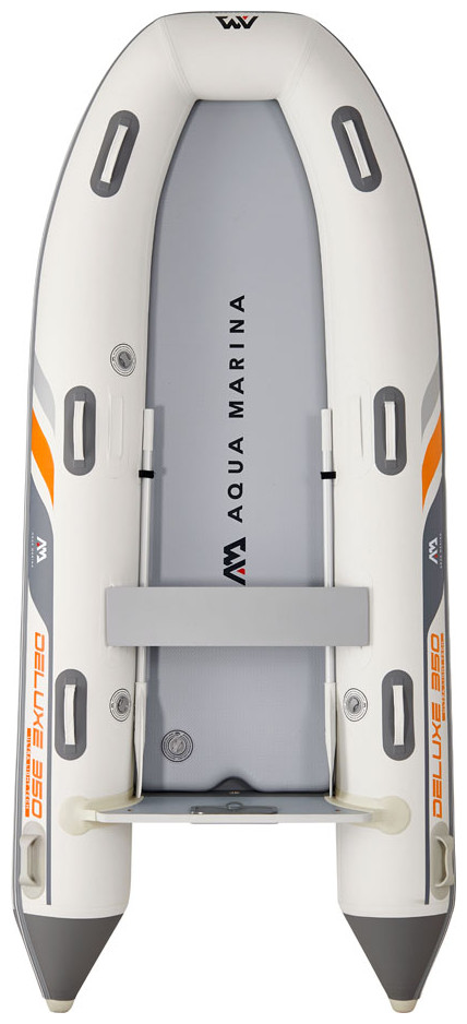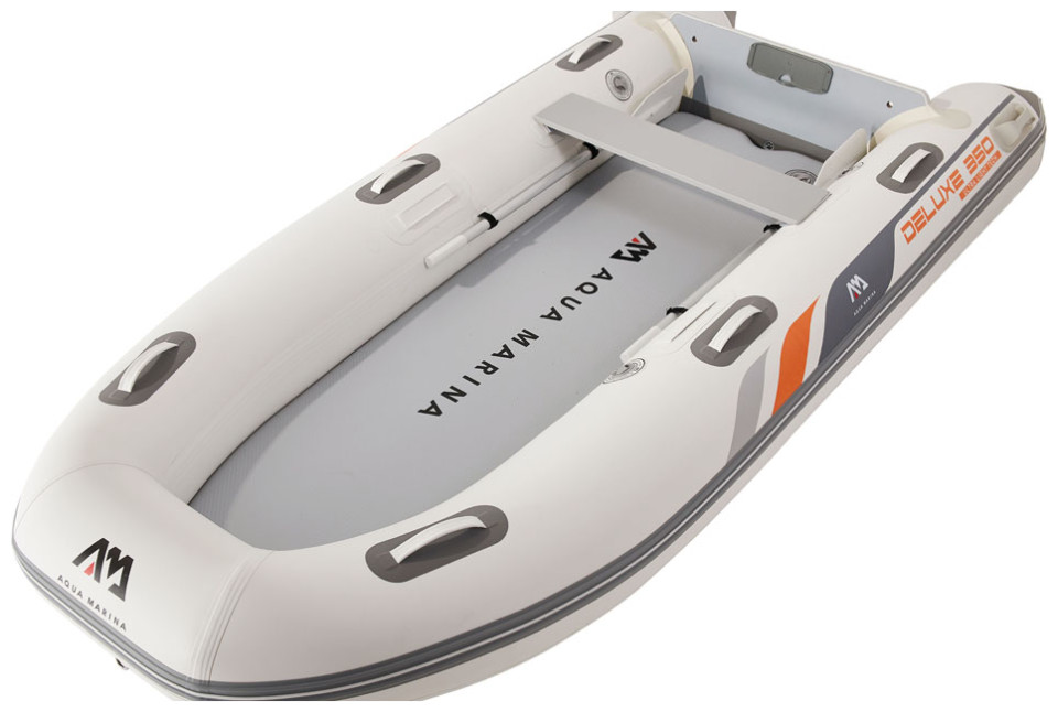 Η φουσκωτή βάρκα DELUXE 350 cm με πλώρη τύπου U είναι συμπαγής και πολύ ελαφριά, κατασκευασμένη με την High Frequency Welding Technology της Aqua Marina στους πλαϊνούς θαλάμους σε συνδυασμό με το Drop Stitch Light Technology στο πάτωμα προσφέρει ασφάλεια και σταθερότητα. Eίναι ιδανική βάρκα αναψυχής με μεγάλα μπαλόνια και αρκετά ευρύχωρη ώστε να μπορεί να μεταφέρει όλο τον εξοπλισμό σας. Η κατασκευή της από υψηλής ποιότητας ενισχυμένο PVC διαθέτει ενσωματωμένο σύστημα ασφάλισης κουπιών για ευκολότερη κωπηλασία, συμπαγή χειρολαβές μεταφοράς και ανοξείδωτο κρίκο πλώρης όπως και βαλβίδα αποστράγγισης, προστατευμένη περιμετρικά από υψηλής ποιότητας καουτσούκ. Ακόμη διαθέτει βάση μηχανής. Η βάρκα DELUXE μαζί με όλα τα αξεσουάρ μπαίνουν στο σάκο μεταφοράς και μπορεί να χωρέσει ακόμα και στο πίσω κάθισμα των περισσοτέρων αυτοκινήτων. Περιλαμβάνει ξύλινο κάθισμα, σάκο μεταφοράς, αντλία αέρος διπλής ενέργειας Liquid Air V1, σετ κουπιών και κιτ επισκευής.