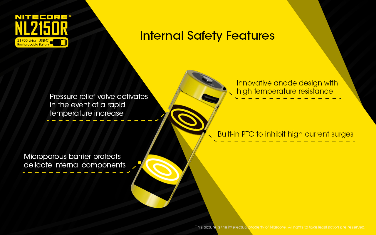 Επαναφορτιζόμενη μπαταρία Nitecore 21700 R ιόντων λιθίου(Li-ion) με ενσωματωμένη θύρα φόρτισης USB-C! Οι μπαταρίες Li-ion 21700 χαρακτηρίζονται από μεγάλη διάρκεια ζωής, με υψηλή πυκνότητα ενέργειας και πολύ ισχυρή απόδοση. Πρωτοεμφανίστηκαν στην βιομηχανία των ηλεκτρικών αυτοκινήτων  και θεωρούνται το μέλλον στις κυλινδρικές μπαταρίες. Χρησιμοποιώντας επαναφορτιζόμενες μπαταρίες ιόντων λιθίου (Li-ion) εξοικονομούν ενέργεια και ελαχιστοποιούν το αποτύπωμα άνθρακα. Έχει την δυνατότητα να φορτιστεί είτε μέσω της ενσωματωμένης θύρας USB-C είτε σε έναν εξωτερικό φορτιστή. Δύο ενδεικτικές λυχνίες στην πλευρά του θετικού πόλου ενημερώνουν για την κατάσταση της φόρτισης. Η κόκκινη ενδεικτική λυχνία ενημερώνει ότι η διαδικασία της φόρτισης είναι σε εξέλιξη. Η πράσινη ενδεικτική λυχνία ενημερώνει ότι η διαδικασία της φόρτισης έχει ολοκληρωθεί. Το υψηλής απόδοσης κύκλωμα προστασίας προστατεύει αυτόματα ενάντια στην υπερβολική φόρτιση, υπερβολικής αποφόρτισης και βραχυκυκλώματος. Ενσωματώνει ένα υψηλής ποιότητας ηλεκτρονικό κύκλωμα προστασίας της μπαταρίας. Επίσης ενσωματώνει δύο MOS FET υψηλής ισχύος στην μονάδα ρύθμισης ρεύματος για αποδοτικότερη και καλύτερη παροχή ρεύματος. Για μέγιστη ασφάλεια και διάρκεια ζωής το φακού διαθέτει εσωτερικά καινοτόμο σχεδιασμό ανοδίου με αντοχή  στις υψηλές θερμοκρασίες, βαλβίδες ανακούφισης πίεσης που ενεργοποιούνται σε περίπτωση ραγδαίας αύξησης της θερμοκρασίας, ενσωματωμένο ηλεκτρονικό κύκλωμα που αναστέλλει μεγάλα κύματα ρεύματος, και μικροπορόδες κάλυμμα το οποίο προστατεύει τα ευαίσθητα εσωτερικά εξαρτήματα. Καθώς επίσης εξωτερικά τα δύο άκρα είναι εφοδιασμένα με προστατευτικές πλάκες από επινικελωμένο ανοξείδωτο ατσάλι, εξασφαλίζοντας υψηλή αντοχή στις κρούσεις, καλή ηλεκτρική αγωγιμότητα και αντίσταση στις οξειδώσεις. Το περίβλημα από ανθεκτικό μεταλλικό φιλμ προσφέρει προστασία ενάντια στη διάβρωση και η ηλεκτρονική πλακέτα προστατεύεται από σκληρό πλαστικό. Ασφάλεια και αξιοπιστία παγκοσμίως ασφαλισμένη και εγκεκριμένη με διεθνή πιστοποιητικά!