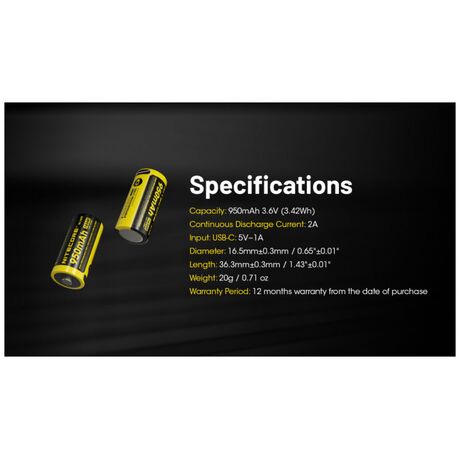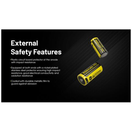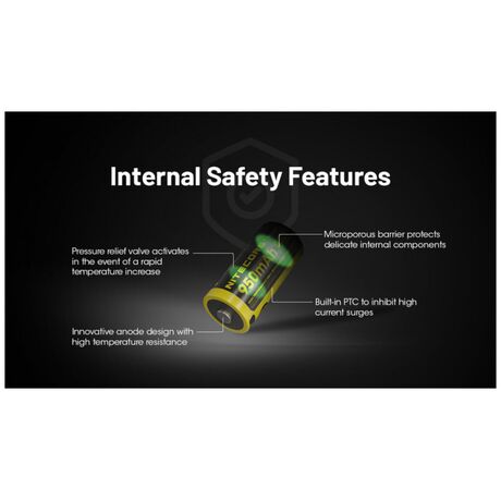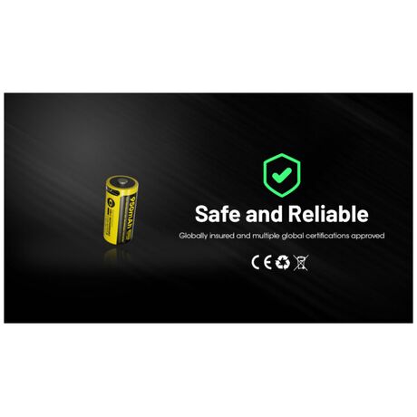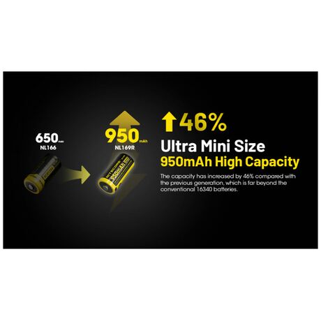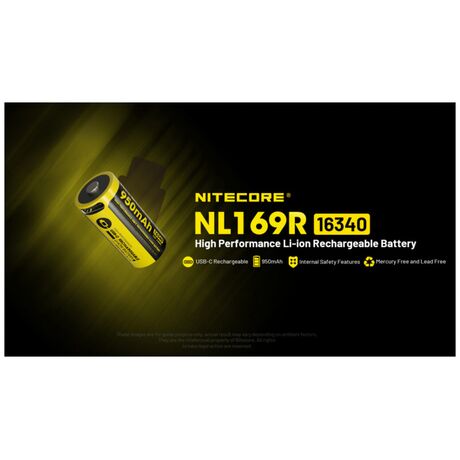 Υψηλής απόδοσης επαναφορτιζόμενη μπαταρία NL169R της Nitecore με τεχνολογία ιόντων λιθίου Li-ion.Έχει την δυνατότητα να φορτίζεται τόσο από την ενσωματωμένη θύρα USB-C όσο και από εξωτερικό φορτιστή. Με σεβασμό στο περιβάλλον καθώς είναι απαλλαγμένη από μόλυβδο, υδράργυρο και κάδμιο, ενώ η διάρκεια ζωής και οι 500 κύκλοι φόρτισης ισοδυναμούν με 16340 συμβατικές μπαταρίες. Ο καινοτόμος σχεδιασμός του ανοδίου με επινικελωμένο ανοξείδωτο ατσάλι την καθιστά ανθεκτική στην αύξηση της θερμοκρασίας ενώ διαθέτει βαλβίδα εκτόνωσης πίεσης σε περίπτωση ταχείας αύξησης της. Εξασφαλισμένη ηλεκτρική αγωγιμότητα, αντοχή στην οξείδωση και αντοχή στην υγρασία, τις πτώσεις και την τριβή. Μία αξιόπιστη και ασφαλής επιλογή με πολλές πιστοποιήσεις παγκοσμίως.