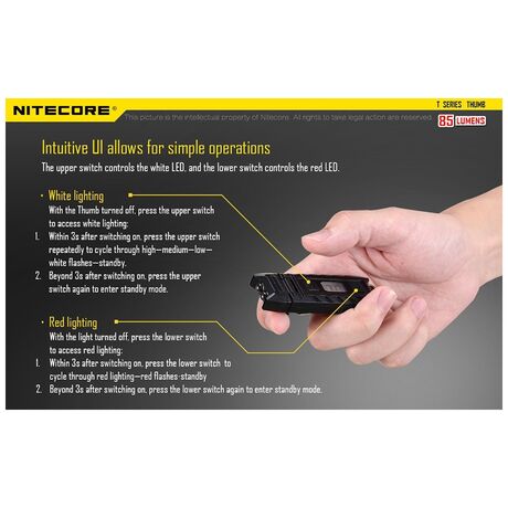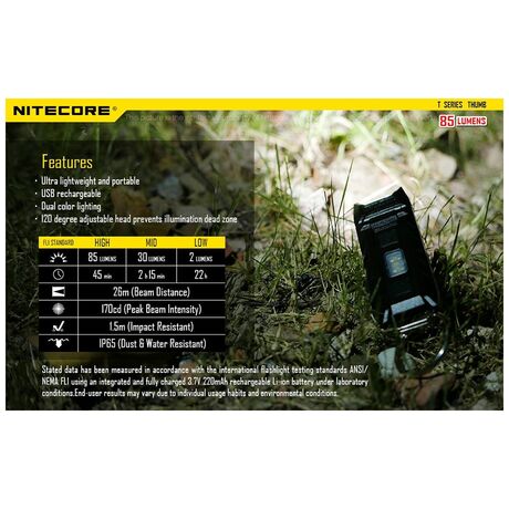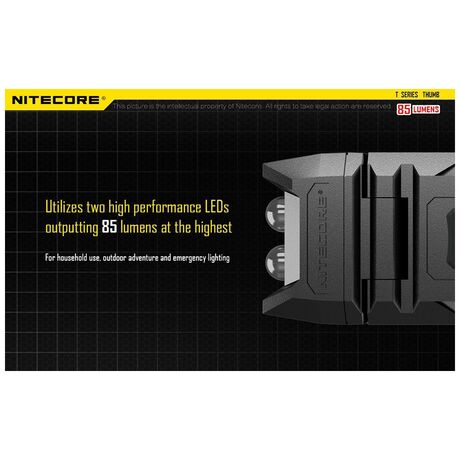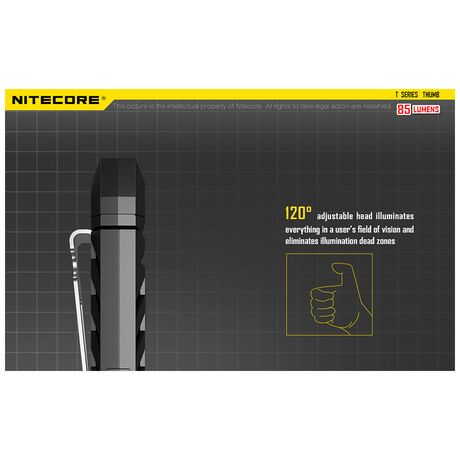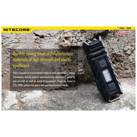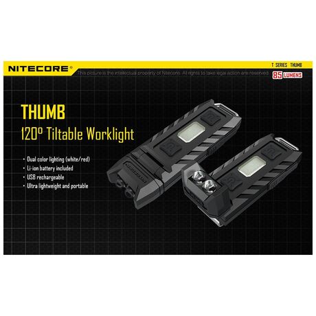 Ο Nitecore Thumb είναι ένας μικρός επαναφορτιζόμενος επιχειρησιακός φακός με σπαστή κεφαλή και δύο χρώματα φωτισμού (Λευκό/Κόκκινο). Επαναφορτίζει την ενσωματωμένη μπαταρία Li-ion μέσω usb. Εξαιρετικά ελαφρύ και φορητό αλλά ταυτόχρονα εξαιρετικά ανθεκτικός κατασκευασμένος από υλικά υψηλής αντοχής. Μεταλλικό κλιπ βοηθά την εύκολη τοποθέτηση σε διάφορα σημεία και ο μεταλλικός κρίκος στο πίσω μέρος του είναι τόσο ανθεκτικός που σηκώνει έως και 35 κιλά.