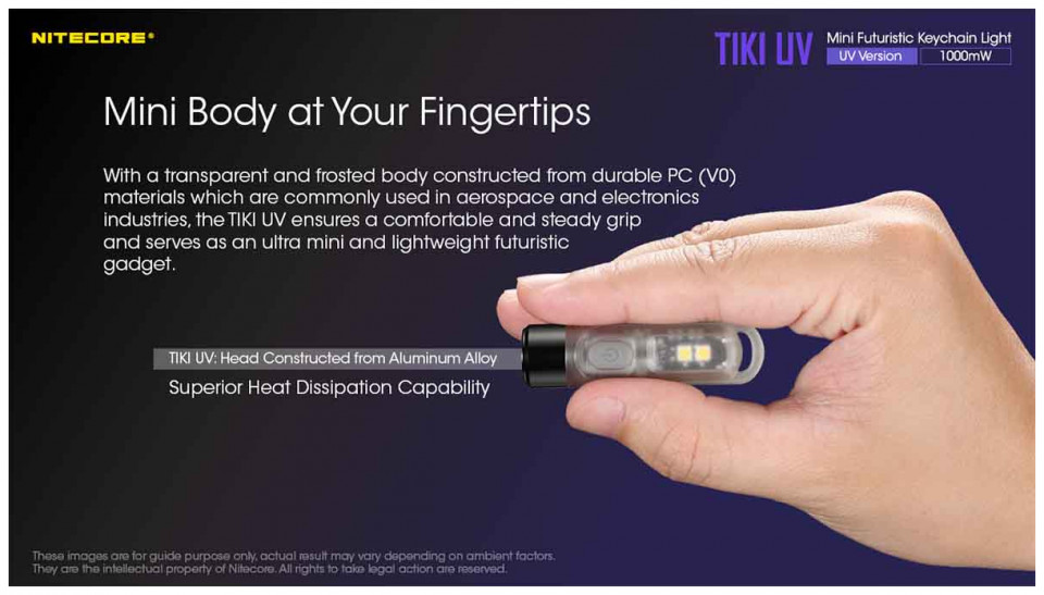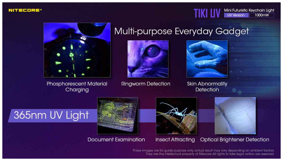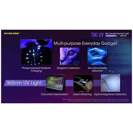 Ανοίξτε το δρόμο για το Nitecore TIKI UV, ένα φως μπρελόκ με έξοδο UV 1000mW. Ο πομπός UV κάνει αυτό το φως την τέλεια λύση για ανίχνευση νομίσματος, εγγράφων και φωσφορίζοντος φωτός. Επιπλέον, εάν χρειάζεστε τακτικό φωτισμό LED, το TIKI UV διαθέτει δύο βοηθητικά LED υψηλής CRI για δευτερεύοντα φωτισμούς πλημμυρών, ιδανικά για ανάγνωση.Η διεπαφή για το TIKI UV είναι απλή και εύκολη στη χρήση. Για στιγμιαία πρόσβαση σε λειτουργία υψηλής υπεριώδους ακτινοβολίας, πατήστε και κρατήστε πατημένο το κουμπί μιας πλευράς, ενώ η σταθερή ενεργοποίηση είναι εφικτή με ένα γρήγορο διπλό πάτημα. Ένα τριπλό πάτημα ενεργοποιεί τις βοηθητικές λευκές λυχνίες LED που θα μετακινούνται από χαμηλά σε υψηλά σε προειδοποιητικό φλας. Με αυτήν τη διεπαφή στη θέση της, είναι εύκολο να αποκτήσετε τη λειτουργία εξόδου που θέλετε γρήγορα και με ακρίβεια.Με ενσωματωμένη μπαταρία ιόντων λιθίου, το TIKI UV έχει μέγιστο χρόνο λειτουργίας 2 ώρες, άφθονο χρόνο για διαλείπουσα χρήση της UV LED. Η ενσωματωμένη θύρα φόρτισης micro-USB διευκολύνει τη φόρτιση εν κινήσει και με οποιοδήποτε κατάλληλο καλώδιο. Και από πλήρως στραγγισμένη κατάσταση, το TIKI UV θα φορτιστεί πλήρως σε 1 ώρα και 20 λεπτά. Δεν έχετε χρόνο να παρακολουθείτε τόσο πολύ; Η ενσωματωμένη ένδειξη φόρτισης θα σας πει όταν τελειώσει η φόρτιση του φωτός όταν το LED μεταβεί από τη σταθερή κατάσταση ON στο OFF.