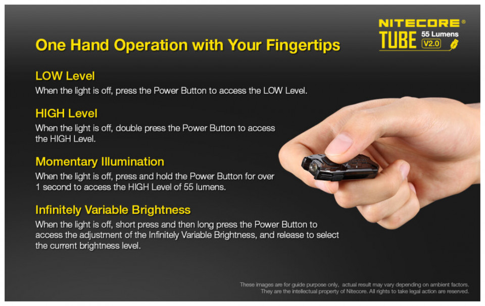 Ο εξαιρετικά ελαφρύς και ανθεκτικός φακός- μπρελόκ Led Nitecore Tube διαθέτει μέγιστη απόδοση έως και 55 Lumens, ενώ η απόσταση εκπομπής της δέσμης του μπορεί να καλύψει μέχρι και 25 μέτρα. Η εξαιρετικά ευρεία δέσμη εκπομπής 100° προσφέρει άψογη περιφερειακή όραση. Έχει τη δυνατότητα επιλογής μεταξύ δύο επιπέδων φωτεινότητας προσβάσιμα μέσω ενός διακόπτη για εύκολη χρήση με το ένα μόνο χέρι! Λειτουργεί με ενσωματωμένη επαναφορτιζόμενη μπαταρία Li-ion υψηλής απόδοσης, η οποία μπορεί να προσφέρει λειτουργία έως και 58 ώρες στην χαμηλή λειτουργία. Η φόρτισή του μπορεί να γίνει με ένα Το προϊόν είναι αδιάβροχο σύμφωνα με την πιστοποίηση IP65. Χάρη στον στιβαρό σχεδιασμό του αντέχει πτώσεις από έως και 1.5 μέτρα ύψος, ενώ το διπλό μεταλλικό δαχτυλίδι, από το οποίο συνοδεύεται, μπορεί να αντέξει μέχρι και 35 κιλά.