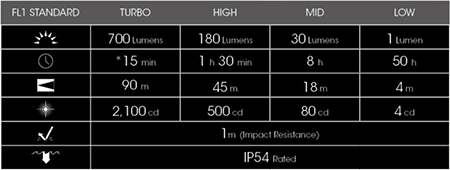 Διαθέτει 2 τρόπους λειτουργίας: την λειτουργία Demo όπου ο φακός απενεργοποιείται αυτόματα μέσα σε 30 δευτερόλεπτα. Σχεδιασμένος για καθημερινή χρήση και φωτισμό σύντομης διάρκειας! Στην καθημερινή λειτουργία ο φακός παραμένει συνεχώς αναμμένος για εξωτερικές δραστηριότητες και χρήσεις που απαιτούν παρατεταμένο φωτισμό όπως περπάτημα στο δάσος ή κάμπινγκ! Υπάρχουν τέσσερα επίπεδα φωτισμού: το χαμηλό (low) με ισχύ δέσμης 1 Lumen, το μεσαίο(mid) με ισχύ δέσμης 30 Lumens, το υψηλό(high) με ισχύ δέσμης 180 Lumens και το turbo με ισχύ δέσμης 700 Lumens! Μπορείτε άμεσα να αποκτήσετε πρόσβαση στον Turbo φωτισμό. Όταν ο φακός είναι απενεργοποιημένος, πατήστε και κρατήστε πατημένο τον διακόπτη επιλογών για περισσότερο από 2 δευτερόλεπτα για να ενεργοποιήσετε στιγμιαία τον φωτισμό Turbo. Απελευθερώστε τον διακόπτη για να τον απενεργοποιήσετε. Όταν ο φακός είναι ενεργοποιημένος, πιέστε και κρατήστε πατημένο τον διακόπτη επιλογών για να ενεργοποιήσετε στιγμιαία τον φωτισμό Turbo. Απελευθερώστε τον διακόπτη για να επιστρέψετε στην προηγούμενη χρησιμοποιημένη ένταση φωτισμού. Αν θέλετε να ενεργοποιήσετε μόνιμα τον φωτισμό Turbo, όταν ο φακός είναι απενεργοποιημένος πιέστε και κρατήστε πατημένο τον διακόπτη επιλογών και απελευθερώστε τον σε περίπου 0,6 δευτερόλεπτα!
