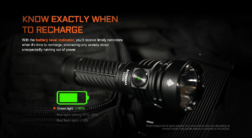 Ο EC90 διαθέτει φόρτιση USB-C για ταχεία επαναφόρτιση, καθώς και δυνατότητα αντικατάστασης μπαταρίας ώστε να παρατείνεται άμεσα ο χρόνος λειτουργίας. Η ένδειξη στάθμης μπαταρίας ενημερώνει πότε χρειάζεται φόρτιση, ώστε να μην μείνετε ποτέ χωρίς φως.