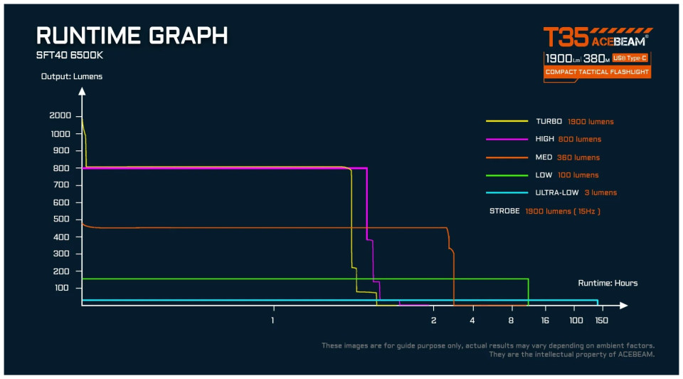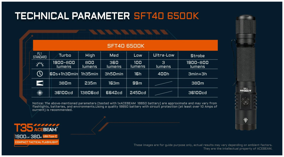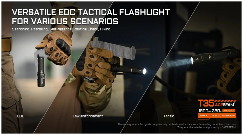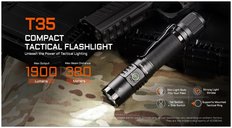 Χρησιμοποιήστε σε κάθε ανάγκη φωτισμού αυτό το κλασικό μοντέλο επιχειρησιακού φακού και κάντε εντύπωση. Ο συμπαγής tactical φακός T35 επιτρέπει την εύκολη εκτέλεση εργασιών σε περιβάλλον χαμηλού φωτισμού. Εξοπλισμένος με το LED SFT40, χρησιμοποιεί μια μπαταρία 18650 για μέγιστη απόδοση 1900 lumens. Όταν έχετε μαζί σας αυτόν τον υπέροχο φακό, αισθάνεστε πιο ασφαλείς και μπορείτε να περπατήσετε στα περισσότερα σκοτεινά μέρη με άνεση, καθώς εκτός από τον επαρκή φωτισμό που παρέχει, αυτός ο φακός είναι σχεδιασμένος για αυτοάμυνα αφού διαθέτει οδοντωτή στεφάνη για επίθεση. Διαθέτει ένδειξη μπαταρίας, πέντε επίπεδα φωτεινότητας και λειτουργία στροβοσκοπίου, έτσι ώστε να μπορεί να καλύψει διαφορετικές απαιτήσεις σε διαφορετικές συνθήκες.