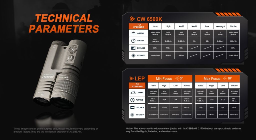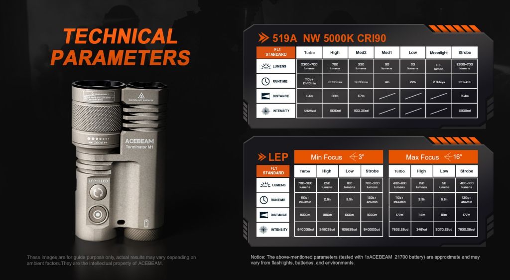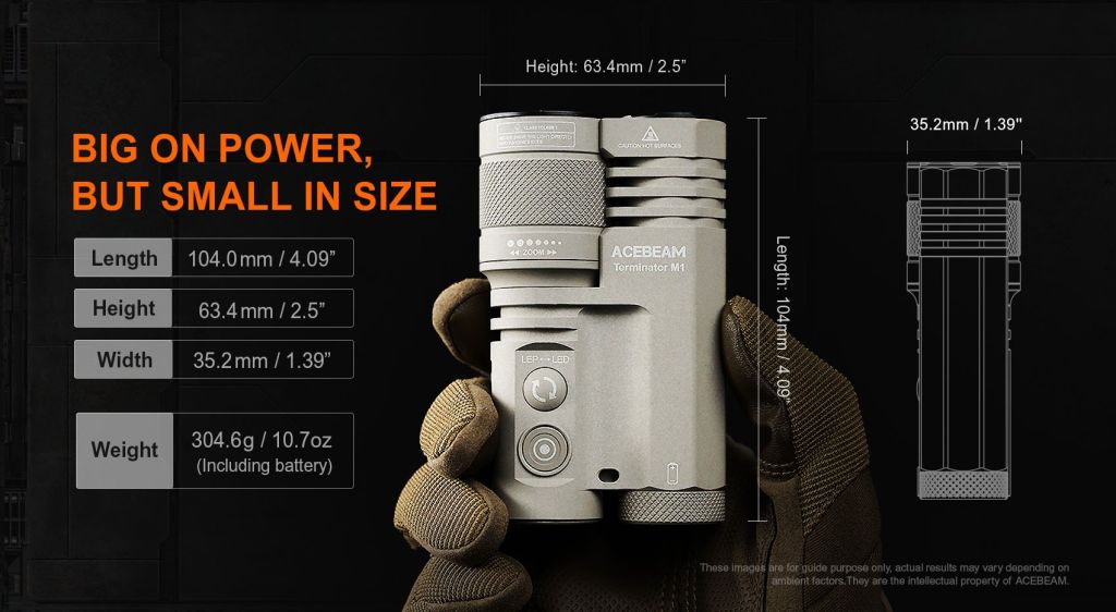 Ο ACEBEAM Terminator M1 έρχεται για να αλλάξει τον τρόπο που βλέπεις τους φακούς. Συνδυάζοντας τις τεχνολογίες LEP και LED, προσφέρει πολύ μεγαλύτερη ευελιξία από έναν φακό με μία μόνο πηγή φωτός. Ο LED προβολέας (floodlight) των 3.500 lumens φωτίζει πλατιά και έντονα τον χώρο μπροστά σου. Ο LEP προβολέας (spotlight) των 1.600 μέτρων προσφέρει απίστευτη ακρίβεια, επιτρέποντάς σου να εστιάζεις σε μακρινούς στόχους με σχεδόν «laser» ακρίβεια. Επιπλέον, ο LEP προβολέας διαθέτει δυνατότητα ζουμ, ώστε να προσαρμόζεις εύκολα τη δέσμη από μακρινή - συγκεντρωμένη, σε πιο πλατιά για φωτισμό μεγαλύτερων περιοχών.