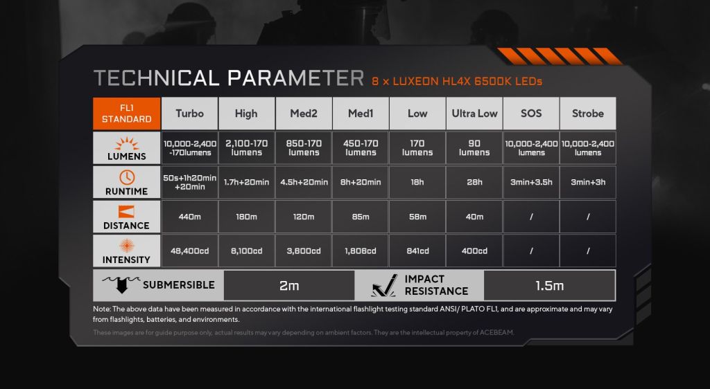 • LEDs 8 x LUXEON HL4X, μέγιστη απόδοση 10.000 lumens, εμβέλεια έως 440 μέτρα