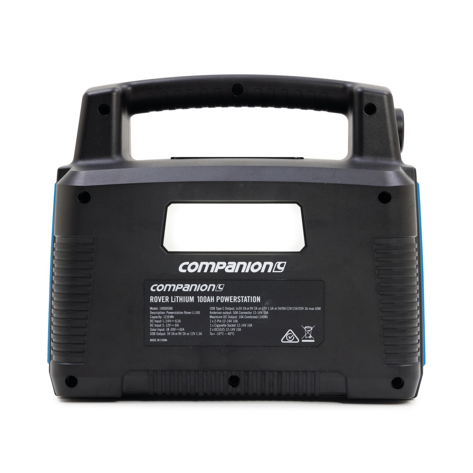 Φορητός Σταθμός Φόρτισης Rover 100 Lithium Companion φορτίζεται με τρεις τρόπους, μέσω AC, DC ή ηλιακού πάνελ χάρη στον ενσωματωμένο ελεγκτή MPPT. Επίσης ο ίδιος μπορεί να φορτίσει συσκευές με πολλαπλές επιλογές εξόδου: με υποδοχή 12V, 4 x USB, 1 x USB C, Anderson και έξοδο 2 ακίδων 12-14V. Η μπαταρία λιθίου LiFeP04 των 100 Ah με 1200 Watt/hours, έχει βελτιωμένη διάρκεια ζωής 2000 κύκλων και 80% χωρητικότητα στη συνέχεια. Ο Rover περιλαμβάνει σύστημα διαχείρισης προστασίας της μπαταρίας, ενσωματωμένο φως LED και οθόνη LCD, ώστε να μπορείτε να είστε σίγουροι ότι όλα λειτουργούν σωστά, τόσο στο power station όσο και στις συσκευές που φορτίζει. Ο Companion Rover Lithium 100AH έχει σχεδιαστεί για να τροφοδοτεί φορητούς ψυγείοκαταψύκτες, laptop & tablet, κινητά τηλέφωνα, ανεμιστήρες και άλλες συσκευές 12V.