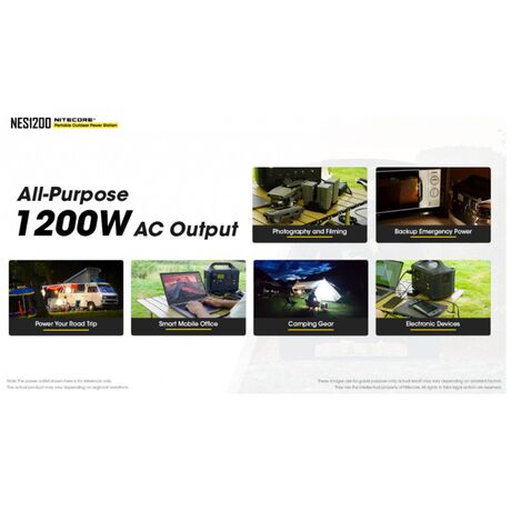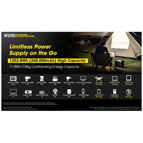 Έξυπνη λύση ενέργειας ενώ βρίσκεστε σε κίνηση φορητός σταθμός ενέργειας Nitecore NES1200 με χωρητικότητα 1252.8 Wh, ισχύ εξόδου 1200W στο AC, πολλαπλές θύρες εξόδου. Η επωνυμία NITECORE έχει κερδίσει μία σειρά από διακρίσεις / βραβεία με διεθνή αξία για 14 χρόνια. Ο τομέας για τις λύσεις ενέργειας σε εξωτερικές δραστηριότητες της NITECORE στοχεύει να δημιουργήσει ένα φιλικό προς το περιβάλλον σύστημα ενέργειας για τους λάτρεις της εξοχής που ο τρόπος ζωής τους συμβαδίζει με την οικολογία και την βιωσιμότητα. Προσπαθούμε να προσφέρουμε την πιο εξελιγμένη τεχνολογικά εμπειρία με επαγγελματικά, αξιόπιστα και αποτελεσματικά συστήματα παροχής ενέργειας, σχεδιασμένα να καινοτομούν στον τρόπο πρόσβασης στην ενέργεια εκτός δικτύου και να επιτρέπουν μια ατέλειωτη παροχή ενέργειας στον δρόμο. Μικρό μέγεθος ο εργονομικός σχεδιασμός με την λαβή από καουτσούκ προσφέρει εύκολη μετακίνηση με το ένα χέρι. Διαστάσεις 317mm x 214mm x 282.5mm βάρος 10,65 κιλά. Μεγάλη χωρητικότητα 348.000mAh ή 1252.8Wh (ώρες λειτουργίας). Αναλογία 11.8Wh (ώρες λειτουργίας) ανά 100g παρέχει σταθερή και ανεξάντλητη ενέργεια κατά την διάρκεια των μετακινήσεων. Φορητό ψυγείο 40W περίπου 48 ώρες Drone 38W περίπου 27 φορτώσεις ανεμιστήρας 40W περίπου 26 ώρες ηλεκτρική κουβέρτα 60W περίπου 17 ώρες προβολέας 100W περίπου 10 ώρες τηλεόραση 150W περίπου 7 ώρες επιτραπέζιος υπολογιστής 200 περίπου 5.5 ώρες ηλεκτρικό τρυπάνι 500W περίπου 2-4 ώρες ηλεκτρικός βραστήρας 800W περίπου 1.2 ώρες Blender 1000W περίπου 2.5 ώρες σφυρί-τρυπάνι 1000W περίπου 1-2 ώρες φούρνος μικροκυμάτων 1200W περίπου 0.9-2 ώρες Mate 40 Pro περίπου  57 Φορτώσεις iPhone 12 Pro περίπου 90 φορτώσεις MacBook Pro 16περίπου  9 φορτώσεις iPad Pro 12.9περίπου 25 φορτώσεις παιχνιδομηχανή φορητή περίπου 58 φορτώσεις. Προαιρετικό καλώδιο φόρτισης μπαταριών του αυτοκινήτου 12 V για φόρτιση έκτακτης ανάγκης ενσωματωμένη ασφάλεια για προστασία από βραχυκύκλωμα κλιπ κροκοδείλου για ασφαλή σύνδεση. Έξοδος εναλλασσόμενου ρεύματος για όλες τις χρήσεις 1200 W κινητά-υπολογιστές φωτογραφικές μηχανές-φορτιστές κάμπινγκ. Καθαρή έξοδος εναλλασσόμενου ρεύματος (AC) ημιτονοειδούς κυματισμού. Όμοια με την τυπική ηλεκτρική ενέργεια εναλλασσόμενου ρεύματος, το καθαρό ημιτονοειδές κύμα είναι φιλικό σε διάφορες ηλεκτρικές συσκευές έχοντας ομαλή και συνεχόμενη μορφή σε αντίθεση με την απότομη και ασταθή έξοδο. Σπονδυλωτό πακέτο μπαταριών με κάθε μπαταρία ξεχωριστά αποθηκευμένη και με ξεχωριστή διαχείριση, το σπονδυλωτό πακέτο μπαταριών μπορεί να εξισορροπήσει αυτόματα την κατάσταση λειτουργίας κάθε στοιχείου μπαταρίας. Τα περιθώρια μεταξύ των μπαταριών είναι μεγαλύτερα από 1,5mm έτσι ώστε ο εσωτερικός χώρος να αερίζεται σωστά και να αποβάλλεται γρήγορα η θερμοκρασία. Σύστημα διαχείρισης των μπαταριών (BMS / Battery Management System) Το BMS του NES1200 έχει σχεδιαστεί ώστε να διαχειρίζεται δυναμικά και να ελέγχει κάθε στοιχείο μπαταρίας 100 φορές το δευτερόλεπτο. Μπορεί να διατηρεί την καλύτερη απόδοση και να προλαμβάνει υπερβολική φόρτιση ή υπερβολική αποφόρτιση των μπαταριών έτσι ώστε να αυξηθεί η διάρκεια ζωής τους. Εγκεκριμένο μετά από έλεγχο σύμφωνα με το πρότυπο UN38.3 Τα 4 κομμάτια αντικραδασμικού καουτσούκ στο κάτω μέρος λειτουργούν ως μαξιλαράκια ώστε να προστατέψουν αποτελεσματικά τις κυψέλες σε μία πτώση ή έναν κραδασμό κατά την διάρκεια της μεταφοράς. Πολλαπλές ασφαλιστικές δικλίδες προστασίας. Προστασία υπερβολικού ρεύματος π