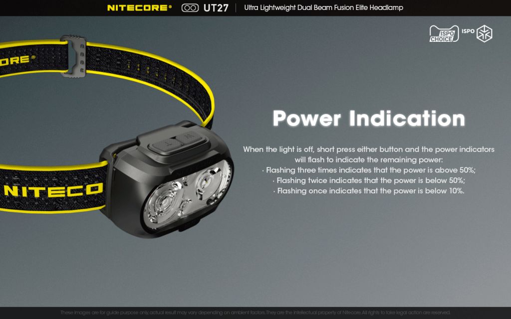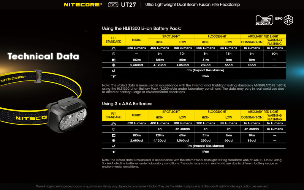 ΦΑΚΟΣ LED NITECORE HEADLAMP UT27 Pro 520Lumens + 2x HBL1300Lion Battery 01. Πολύ ελαφρύς (74g) και ισχυρός (520 Lumens) φακός κεφαλής που συνδυάζει εξαιρετικά δύο δέσμες φωτισμού. Διαθέτει δύο τρόπους τροφοδοσίας. 02. Σχεδιασμένος για να μπορεί να χρησιμοποιηθεί σε πολλές περιπτώσεις. Καλύπτει όλες τις ανάγκες φωτισμού τόσο στις εξωτερικές σας δραστηριότητες όσο και στις επαγγελματικές βαριές εργασίες. 03. Η NITECORE σχεδιάζει και παράγει ελαφριά προϊόντα εξοπλισμού για δρομείς ορεινών διαδρομών όπως Ζώνες για τρέξιμο, Ελαφριά Power Bank με ανθρακονήματα, Φακούς κεφαλής που έχουν γίνει δημοφιλή στην παγκόσμια κοινότητα. 04. " Κομμένο & Ραμμένο " για τους λάτρεις του τρεξίματος σε ορεινά μονοπάτια. Μετά από εξονυχιστική ανάλυση και έρευνα των συνηθειών από χιλιάδες δρομείς τα προηγούμενα χρόνια, επιλέξαμε τα καλύτερα υλικά για τα τελευταία μας προϊόντα και ολοκληρώσαμε ένα πολύ ελαφρύ σχέδιο με Μινιμαλιστικά στοιχεία σε κάθε λεπτομέρεια. JIANSENG SHEN Πρεσβευτής της NITECORE , Πρωταθλητής του ΗΚ100 2019 " Οι δρομείς δίνουν μεγάλη έμφαση στο βάρος του εξοπλισμού καθώς κάθε γραμμάριο μετράει στους αγώνες ορεινών διαδρομών. Συνήθως οι αγώνες αυτοί συνδυάζουν μεγάλες αποστάσεις και σκληρό περιβάλλον. Όσο χαμηλότερο βάρος κουβαλούμε τόσο ευκολότερα μπορούμε να τρέξουμε" 05. Αφάνταστα χαμηλό βάρος (74g) . 06. Εξαιρετική απλότητα , Μηδενική αίσθηση βάρους. - Σύστημα Κάτοπτρου TIR. Πολύ λεπτός σχεδιασμός με ενιαίο σώμα. - Βάση στήριξης στον ιμάντα. Ισχυρή και ασφαλή με το λιγότερο υλικό. - Ιμάντας κεφαλής . Άνετος και αναπνέει. - Σώμα. Κατασκευασμένος από ελαφριά και ανθεκτικά PC+ABS υλικά. 07. Περιλαμβάνει δύο (2) επαναφορτιζόμενες μπαταρίες HBL1300 που διαθέτουν ενσωματωμένη θύρα USB-C για άμεση φόρτιση. Η χωρητικότητα της κάθε μπαταρίας είναι 1300mAh και μία πλήρη φόρτιση διαρκεί 1 ώρα και 50 λεπτά . Η κόκκινη ενδεικτική λυχνία καταδεικνύει την διαδικασία της φόρτισης και η πράσινη την ολοκλήρωση της. 08. Δύο πηγές τροφοδοσίας - Με την εύκολα εναλλασσόμενη επαναφορτιζόμενη μπαταρία Ιόντων Λιθίου (Li-ion) HBL3 που παρέχει μεγάλη διάρκεια λειτουργίας. Η μπαταρία αυτή καλύπτει τις σκληρές απαιτήσεις για τον εξοπλισμό που θέτουν πολλοί αγώνες ορεινών διαδρομών. - Με τρείς (3) κοινές αλκαλικές μπαταρίες μεγέθους AAA 09. Ο χώρος των μπαταριών φωσφορίζει στο σκοτάδι ! Ευρεσιτεχνία Επινόησης Αναμένεται, Αριθμός φακέλου 202110998288.6 Ευρεσιτεχνία Βιομηχανικού Σχεδιασμού Αναμένεται, Αριθμός φακέλου 202122056854.Χ Φροντίζουμε για την ασφάλεια σας, όταν όλα "σβήσουν" .Με τις ετικέτες πολικότητας να φαίνονται εύκολα το βράδυ, μπορείτε να εντοπίσετε και να αντικαταστήσετε τις μπαταρίες χωρίς καθυστέρηση. 10. Προτεινόμενες επιλογές ενέργειας ανάλογα με τις δραστηριότητες σε εξωτερικό περιβάλλον - Για αγώνες 50 χιλιομέτρων * Μία μπαταρία HBL1300 και Ένα Power Bank NB10000 - Για αγώνες 100 χιλιομέτρων *Δύο μπαταρίες HBL1300 και Ένα Power Bank NB10000 - Καθημερινή χρήση ή Χρήση έκτακτης ανάγκης / Κάμπινγκ / Πεζοπορία * Μία μπαταρία HBL1300 και Τρείς μπαταρίες αλκαλικές ΑΑΑ 11. Συγκεντρωμένος φωτισμός + Διάχυτος φωτισμός Σχεδιασμός που συνδυάζει δύο είδη φωτισμού * Λειτουργία αναζήτησης 520 Lumens . Ιδανική για σύντομες αναζητήσεις. Συνδυασμός συγκεντρωμένης και διάχυτης δέσμης. * Συγκεντρωμένος φωτισμός 400Lumens. Διαπεραστικός φωτισμός μεγάλης απόστασης ιδανικός για τον εντοπισμό σημάνσεων ή χρήση σε βροχή, χιονόπτωση ή ομίχλη. * Διάχυτος φωτισμός 200 Lumens . Πολύ απαλός και άνετος φωτισμός, ιδανικ