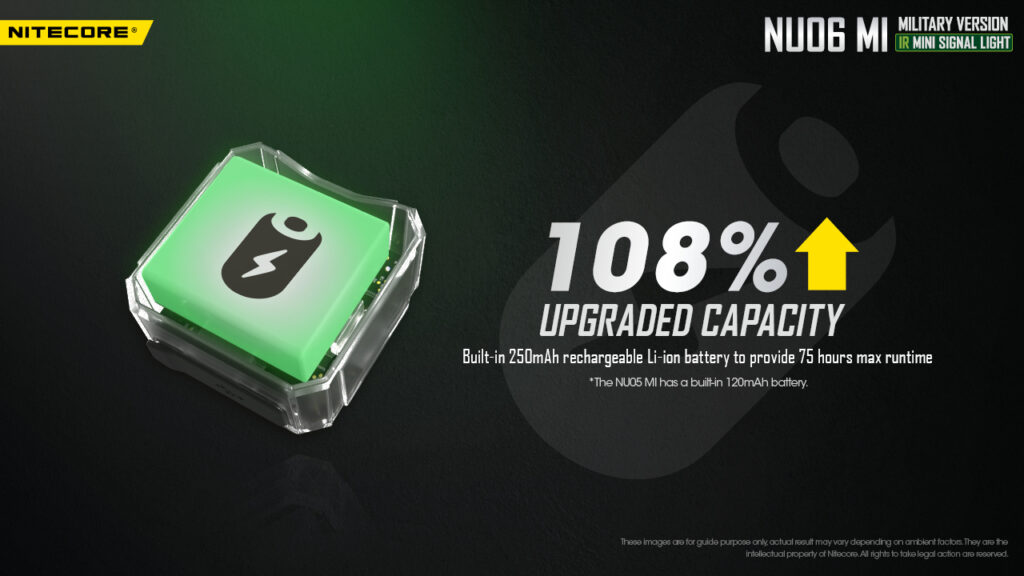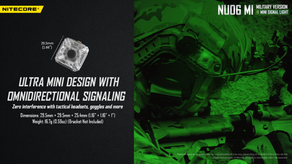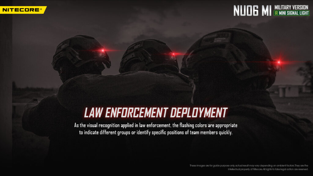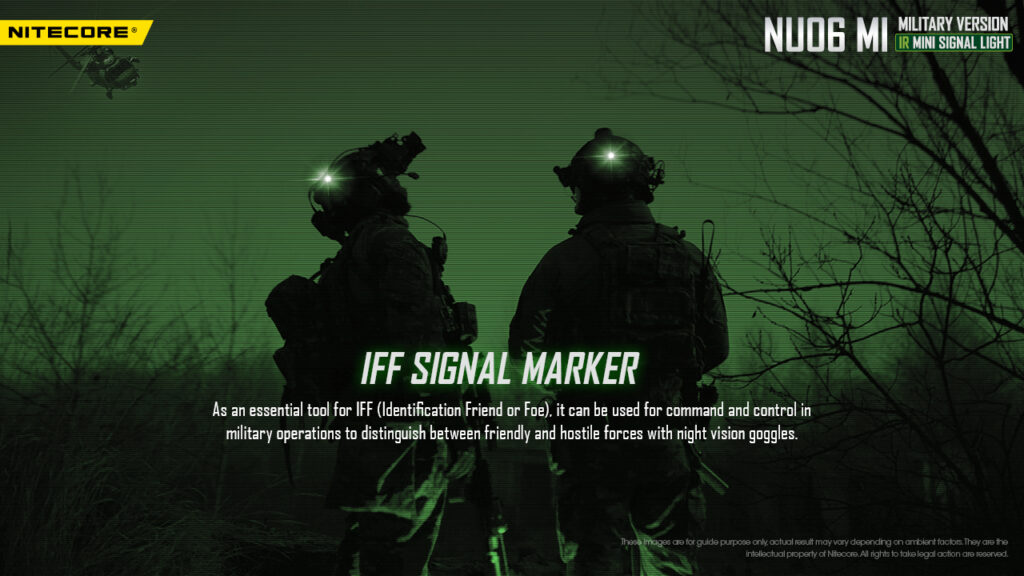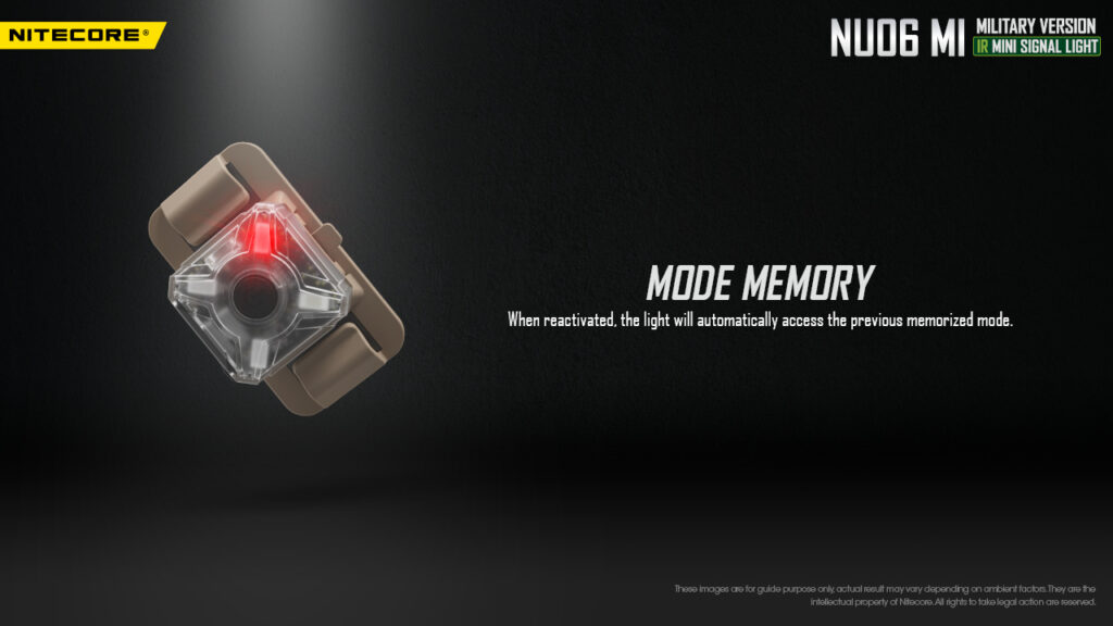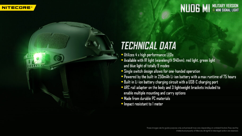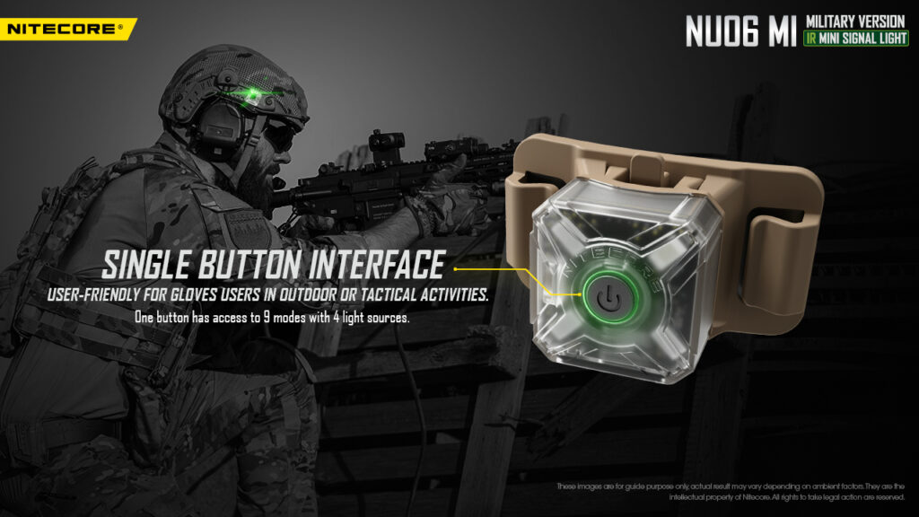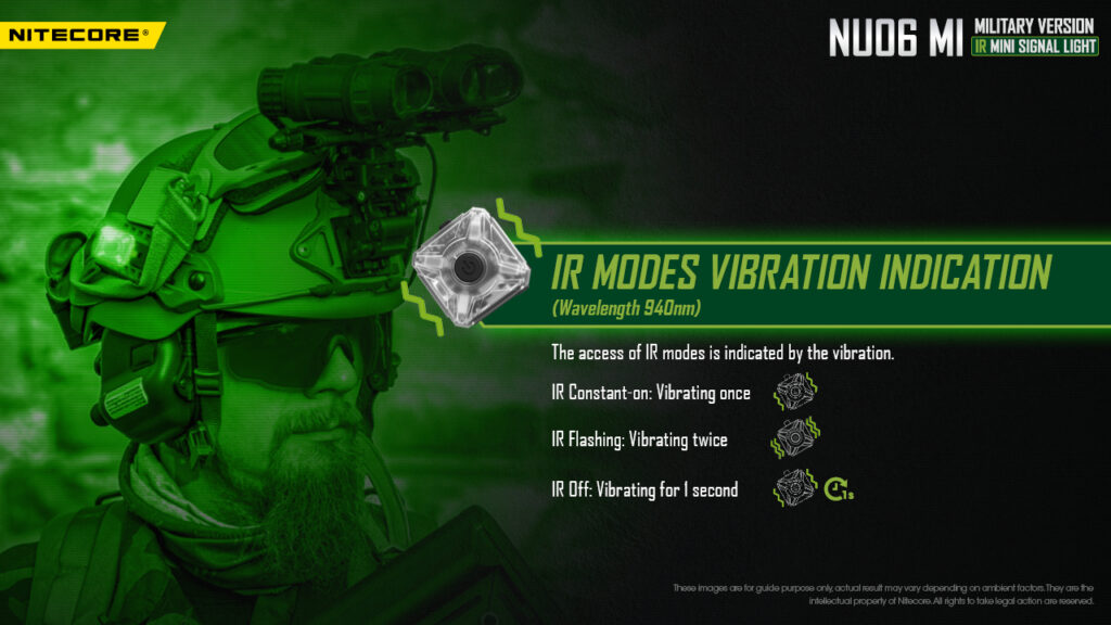 ΦΑΚΟΣ LED NITECORE HEADLAMP NU06MI 001. Μικρός Υπέρυθρος σημαντήρας, Στρατιωτική έκδοση - Τέσσερις (4) πηγές φωτισμού - Εννέα (9) τρόποι λειτουργίας - Πολύ μικρή κατασκευή - Υπέρυθρος φωτισμός, Κόκκινος Φωτισμός, Πράσινος Φωτισμός, Μπλε Φωτισμός 002. Σημαντήρας IFF Ως ένα ευαίσθητο εργαλείο για IFF (Αναγνώριση φίλων ή εχθρών) μπορεί να χρησιμοποιηθεί για την διοίκηση και τον έλεγχο σε στρατιωτικές επιχειρήσεις για τον διαχωρισμό μεταξύ φίλιων και εχθρικών δυνάμεων με την χρήση συσκευών νυχτερινής όρασης. 003. Ανάπτυξη ομάδων επιβολής του νόμου. Καθώς η οπτική αναγνώριση εφαρμόζεται στις ομάδες επιβολής του νόμου, τα χρώματα του σημαντήρα είναι τα κατάλληλα για να καταδείξουν τις διαφορετικές ομάδες ή τις διαφορετικές θέσεις μελών ομάδων , με μεγάλη ταχύτητα. 004. Εννέα τρόποι φωτισμού με την χρήση των τεσσάρων φωτισμών - Κόκκινο σταθερά αναμμένο - Κόκκινο που αναβοσβήνει - Πράσινο σταθερά αναμμένο - Πράσινο που αναβοσβήνει - Μπλε σταθερά αναμμένο - Μπλε που αναβοσβήνει - Υπέρυθρο σταθερά αναμμένο - Υπέρυθρο που αναβοσβήνει - Εναλλασσόμενο Κόκκινο-Μπλε (Αστυνομίας) 005. Οι επιλογές φωτισμού με τον υπέρυθρο φωτισμό, συνοδεύονται από δόνηση - Υπέρυθρος φωτισμός σταθερά αναμμένος: Μία δόνηση - Υπέρυθρος φωτισμός που αναβοσβήνει : Δύο δονήσεις - Απενεργοποίηση Υπέρυθρου Φωτισμού: Δόνηση για 1 δευτερόλεπτο 006. Φωτισμοί - Σταθερά αναμμένοι Με αυτές τις επιλογές φωτισμού, ο NU06MI θα μεταμορφωθεί σε συμπληρωματική πηγή φωτισμού - Ο Πράσινος φωτισμός παρέχει 8 Lumens - O Κόκκινος φωτισμός παρέχει 3 Lumens - Ο Μπλε φωτισμός παρέχει 2 Lumens 007. Βελτιωμένη χωρητικότητα κατά 108% Ενσωματωμένη επαναφορτιζόμενη μπαταρία με χωρητικότητα 250mAh που παρέχει 75 ώρες συνεχόμενης λειτουργίας *