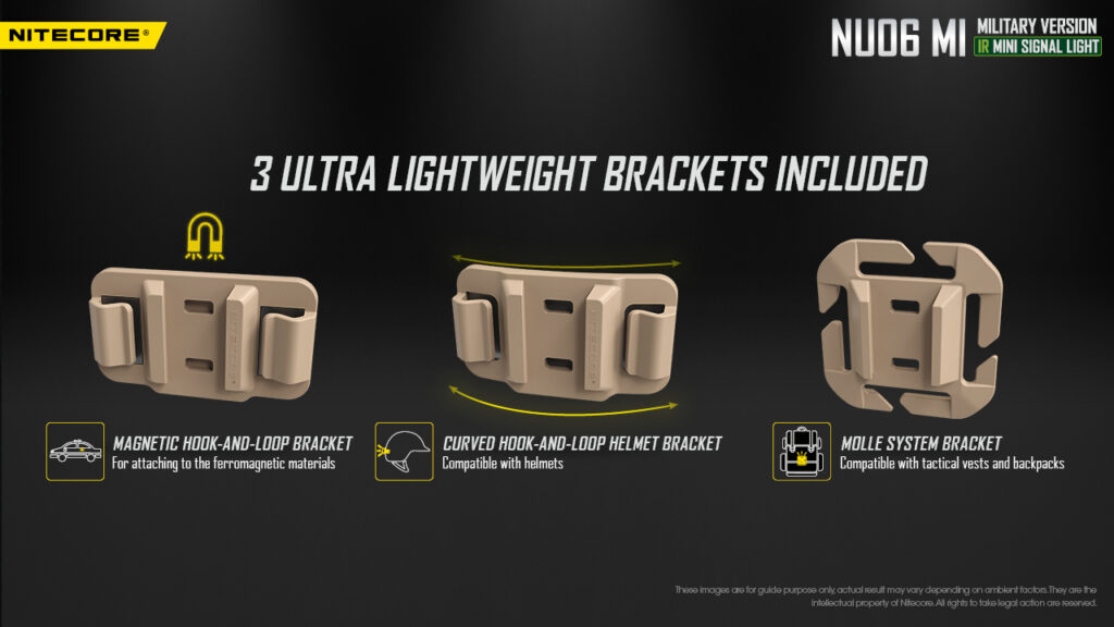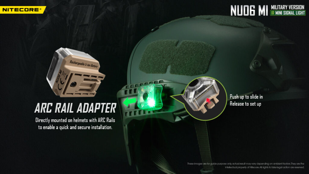 Ο NU05 έχει ενσωματωμένη επαναφορτιζόμενη μπαταρία με χωρητικότητα 120mAh 008. Ο ενσωματωμένος αντάπτορας για ράγες ARC Τοποθετείτε άμεσα σε κράνη με ράγες ARC γρήγορα και με ασφάλεια. - Τραβήξτε προ τα επάνω το κλιπ για να το τοποθετήσετε στο κράνος - Απελευθερώστε το κλιπ για να το ασφαλίσετε. 009. Εξαιρετικά μικρό μέγεθος με Πολυκατευθυντική σήμανση Μηδενική παρενόχληση στα κράνη, τα γυαλιά και άλλα αξεσουάρ Διαστάσεις: 29,5mm x 29,5mm x 25,4mm Βάρος: 16,7g (Η βάση δεν περιλαμβάνεται) 010. Τρεις πολύ ελαφρές βάσεις περιλαμβάνονται στη συσκευασία - Μαγνητική βάση με προσαρμογή τύπου βέλκρο Για την στήριξη σε σιδηρο-μαγνητικές επιφάνειες - Κυρτή βάση για προσαρμογή σε κράνη - Βάση στήριξης σε συστήματα ανάρτησης MOLLE Συμβατή με γιλέκα και σακίδια 011. Λειτουργία με ένα μοναδικό κομβίο Φιλικό για χρήση με γάντια σε επιχειρησιακές ή εξωτερικές δραστηριότητες Με το μοναδικό αυτό κομβίο ο χρήστης έχει πρόσβαση στις εννέα λειτουργίες με τα τέσσερα είδη φωτισμού. 012. Επαναφορτίζεται από θύρα USB-C Η θύρα USB-C επιτρέπει την φόρτιση χωρίς να έχει φορά σύνδεσης Η εσωτερική αδιάβροχη σχεδίαση το καθιστά άφοβο από την βροχή και τις πιτσιλιές. 013. Έχει δυνατότητα συνεχούς τροφοδοσίας από συσκευές παροχής ενέργειας με θύρες USB Απολαύστε την ανεξάντλητη παροχή ενέργειας κατά την έξοδο σας ακόμα και κατά την διάρκεια της φόρτισης έτσι ώστε να αποφύγετε την έλλειψη ενέργειας. 014. Μνήμη λειτουργίας Όταν ενεργοποιείται ξανά, θα ανάψει αυτόματα στην τελευταία λειτουργία στην οποία βρισκόταν πριν απενεργοποιηθεί. 015. Ενδεικτική λυχνία ισχύος Όταν ο φακός είναι απενεργοποιημένος, πιέστε σύντομα το κομβίο ισχύος: - Τριπλό αναβόσβημα της λυχνίας καταδεικνύει ότι η ισχύς της μπαταρίας βρίσκεται πάνω από το 50% - Διπλό αναβόσβημα της λυχνίας καταδεικνύει ότι η ισχύς της μπαταρίας βρίσκεται κάτω από το 50% - Μονό αναβόσβημα της λυχνίας καταδεικνύει ότι η ισχύς της μπαταρίας βρίσκεται κάτω από το 10% 016. Μπορεί να χρησιμοποιηθεί κάτω από οποιεσδήποτε καιρικές συνθήκες. Βαθμολογημένος με IP66 Ανθεκτικός σε πτώσεις έως και από 1 μέτρο 017. Πίνακας σύγκρισης ανάμεσα στα μοντέλα σημαντήρων της NITECORE - NU05 - NU05Mi - NU06LE - NU06Mi - NU07LE 018. Πίνακας τεχνικών στοιχείων χρήσης ανάλογα με το είδος φωτισμού 019. Χαρακτηριστικά - Ενσωματώνει Τέσσερα 4 x Leds Υψηλής απόδοσης - Διαθέτει Υπέρυθρο Φωτισμό με μήκος κύματος 940nm, Κόκκινο φωτισμό, Πράσινο φωτισμό, Μπλε φωτισμό με συνολικά 9 επιλογές φωτισμού - Ο ένας και μοναδικός διακόπτης λειτουργίας επιτρέπει την χρήση του με γάντια - Τροφοδοτείται από μία ενσωματωμένη επαναφορτιζόμενη μπαταρία με χωρητικότητα 250mAh που μπορεί να παρέχει ενέργεια έως και 75ώρες. - Διαθέτει ενσωματωμένο κύκλωμα φόρτισης με θύρα εισόδου USB-C - Διαθέτει αντάπτορα για προσαρμογή σε ράγες κράνους ARC και συνοδεύεται από 3 ελαφρές βάσεις για την προσάρτηση με πολλούς τρόπους. - Είναι κατασκευασμένο από ανθεκτικά πολυκαρβονικά υλικά - Ανθεκτικό σε πτώσεις έως και από 1 μέτρο.