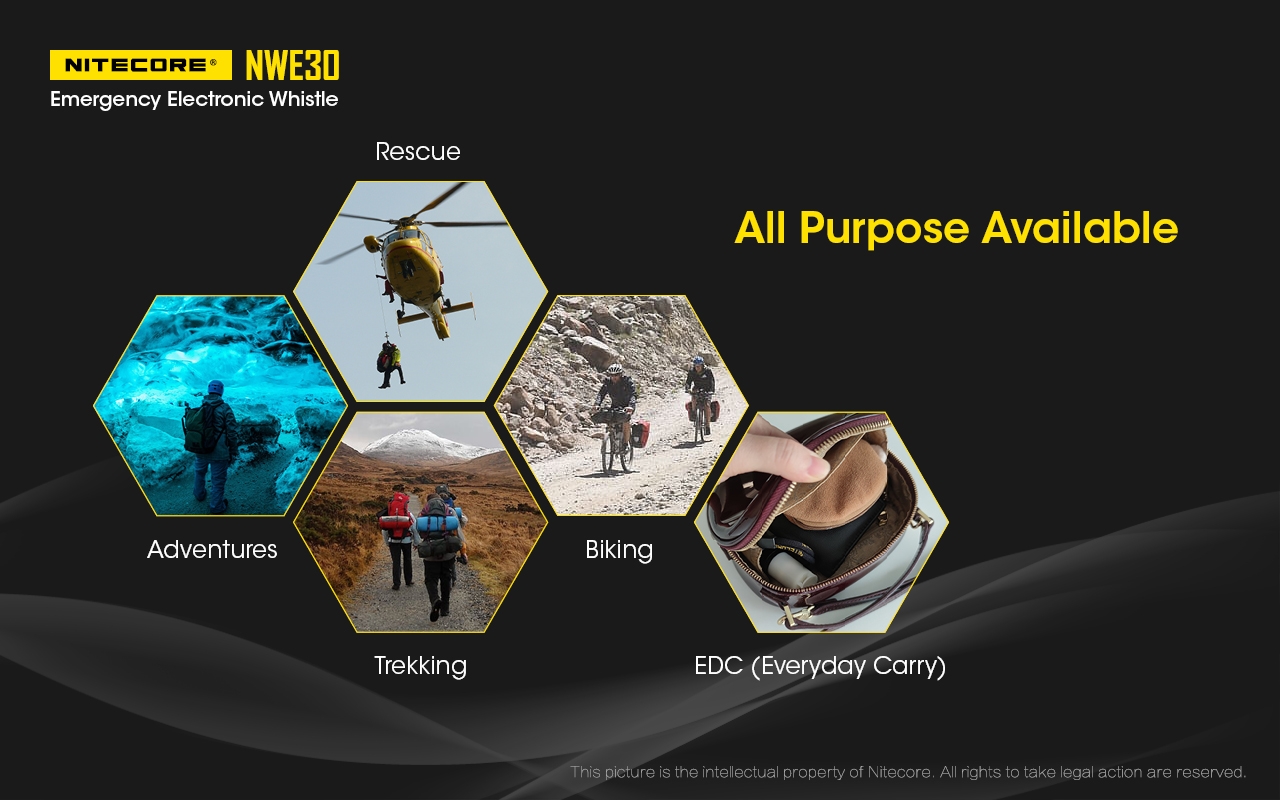 Ηλεκτρονική σφυρίχτρα NWE30 Nitecore με εύχρηστο τρόπο ενεργοποίησης με περιστροφή. Το διακοπτόμενο ηχητικό σήμα των 12dB είναι ειδικά σχεδιασμένο για καταστάσεις έκτακτης ανάγκης. Σε αντίθεση με την κοινή μέθοδο σφυρίγματος με φύσημα, στοχεύει να εξοικονομήσει την απαραίτητη ενέργεια στον χρήστη όταν έχει προκύψει σοβαρός τραυματισμός, υποθερμία ή ασθένεια. Μόλις ενεργοποιηθεί θα παράγει ήχο μία φορά κάθε 10 δευτερόλεπτα. Ενσωματώνει τέσσερα (4) LED Luminus SST-20-W με ένα κυλινδρικό πολυκαρβονικό διαθλαστή, ο NWE30 εκπέμπει περιμετρικό (360°) φωτισμό εντοπισμού με ισχύ 2000 Lumens που ενεργοποιείται αυτόματα μόλις νυχτώσει ή σε περιβάλλον με χαμηλό φωτισμό. Μόλις ξημερώσει ο φωτισμός απενεργοποιείται αυτόματα για εξοικονόμηση ενέργειας και αύξηση της διάρκειας λειτουργίας. Μία μπαταρία CR123 που περιλαμβάνεται στην συσκευασία διαρκεί για 72 ώρες συνεχόμενης χρήσης. Το σύστημα διάθλασης του ήχου προς όλες τις κατευθύνσεις εξασφαλίζει την ομοιόμορφη κατανομή του. Απαραίτητη προσθήκη για τον εξοπλισμό των εξωτερικών σας δραστηριοτήτων. Μπορεί να λειτουργήσει σε κάθε είδους περιβάλλον, βαθμολογημένη με IP68. Υποβρύχια έως και 2 μέτρα βάθος, ανθεκτική σε πτώσεις έως και από 1 μέτρο ύψος. Η βάση είναι κατασκευασμένη από κράμα αλουμινίου αεροναυπηγικής ποιότητας με φινίρισμα σκληρής ανοδίωσης στρατιωτικών προδιαγραφών, εξαιρετική σκληρότητα και αντοχή.