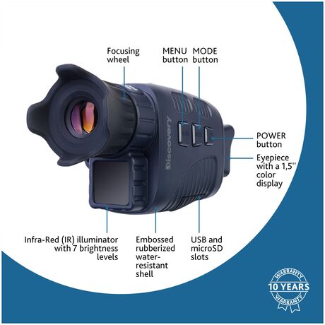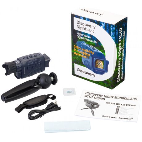 Ψηφιακό μονοκιάλι νυχτερινής όρασης με τρίποδα ΜL10 με έγκριση από το Discovery Channel! Η σειρά οπτικών οργάνων Discovery παράγεται από την κορυφαία εταιρεία Levenhuk. Η συσκευή αυτή διαθέτει ενσωματωμένο καταγραφέα και του δίνει τη δυνατότητα χρήσης είτε ως συσκευή παρατήρησης είτε ως συσκευή λήψης φωτογραφιών και καταγραφής βίντεο. Σε συνθήκες χαμηλού φωτισμού αποδίδει ασπρόμαυρες εικόνες ενώ κατά την διάρκεια της ημέρας και σε συνθήκες έντονης φωτεινότητας χρησιμοποιείται ως τυπικό μονοκιάλι αποδίδοντας έγχρωμες εικόνες. Η συσκευή αυτή είναι μια εξαιρετική επιλογή για νυχτερινό κυνήγι, πεζοπορίες, εξερεύνηση αγνώστων περιοχών και ότι άλλο μπορείτε να φανταστείτε.