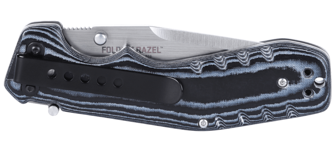 Το Folding Razel™ διαθέτει μια ελαφρώς καμπύλη κύρια λεπίδα 3,13 ιντσών και μια ευθεία άκρη κοπιδιού 1,25 ιντσών από ανοξείδωτο ατσάλι υψηλής περιεκτικότητας σε άνθρακα, η οποία είναι ιδανική για κοπές με ώθηση, τεμαχισμό, ξύσιμο και οτιδήποτε άλλο. Το μαχαίρι έχει ανατομικές λαβές από micarta για ασφαλή κράτημα, ένα εύκολα προσβάσιμο κλείδωμα με Manual Liner Safety και ένα κουμπί για γρήγορο άνοιγμα. Περιλαμβάνονται δύο διαφορετικοί τύποι αφαιρούμενων κλιπ τσέπης, που επιτρέπουν πολλαπλούς τρόπους μεταφοράς του μαχαιριού.