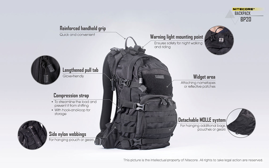 Σακίδιο πλάτης 20L με την υπογραφή της κορυφαίας εταιρείας Nitecore κατασκευασμένο από πολύ ανθεκτικό συνθετικό ύφασμα στρατιωτικών προδιαγραφών με πλέξη 1000D που εξασφαλίζει εξαιρετική αντίσταση στο ξήλωμα, την τριβή και το σκίσιμο! Επιπλέον, λόγω της επικαλυμμένης επιφάνειας διαθέτει εξαιρετική αντοχή στο νερό και στη βρωμιά. Η πλάτη είναι εργονομικά σχεδιασμένη με ύφασμα με μορφή ανοιχτού πλέγματος και ο σχεδιασμός της ράχης σε μορφή σανίδας υποστηρίζουν τον αερισμό, ενώ η καμπύλη στη ράχη ελαττώνει την πίεση στη σπονδυλική στήλη. Είναι εξοπλισμένο με ιμάντες ώμων οι οποίοι είναι παραγεμισμένοι με αφρώδες υλικό για μεγαλύτερη άνεση κατά τη μεταφορά. Διαθέτει ένα ευρύχωρο εσωτερικό μέσα στο οποίο μπορείτε να τοποθετήσετε Laptop, ρούχα, κουβέρτες, παπούτσια, σημειωματάρια κλπ.